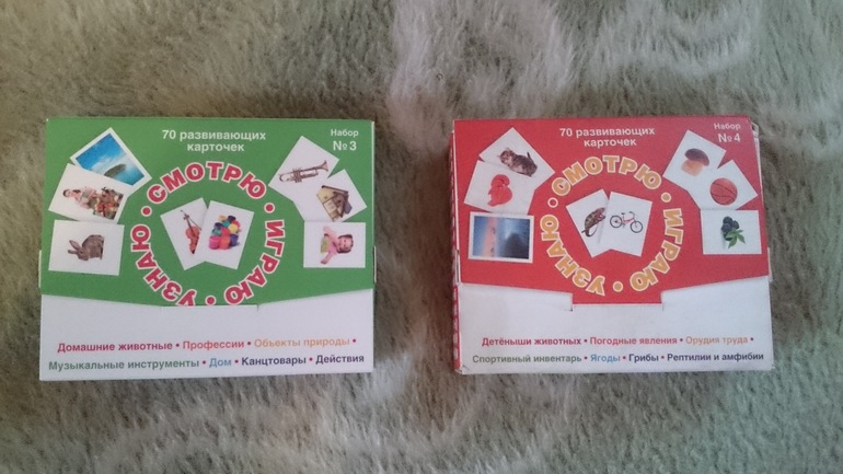 3ий и 4ый наборы карточек "Смотрю. Играю. Узнаю" докупила к 1ым двум. Карточки смотрим постоянно, несколько раз в день, подкрепляя реальными предметами. Сынуля сам просит их.