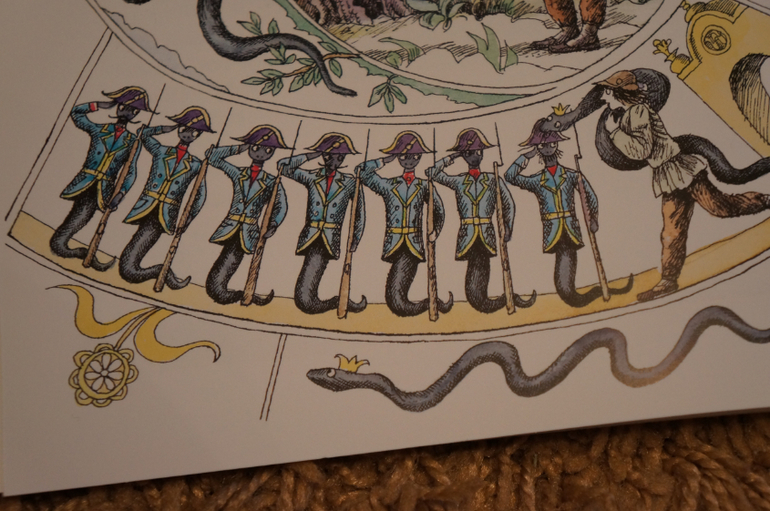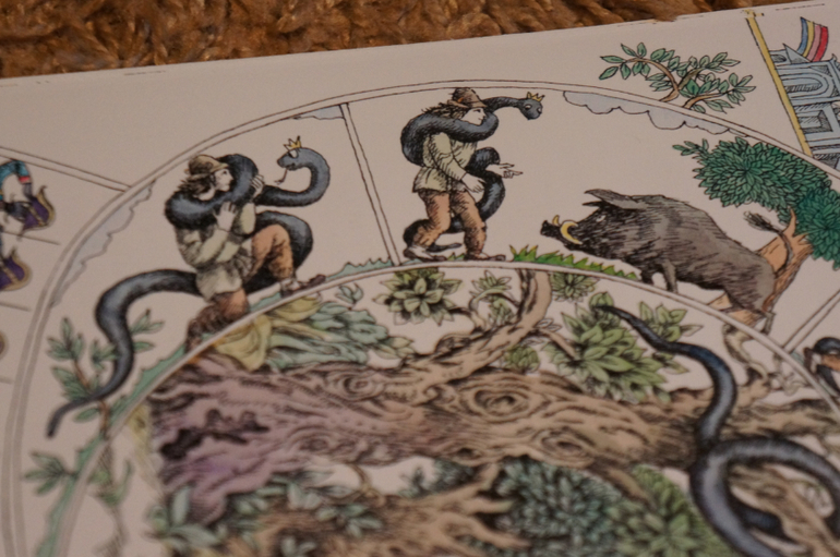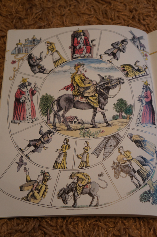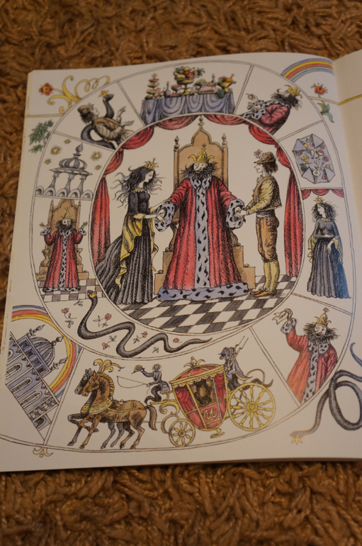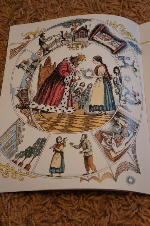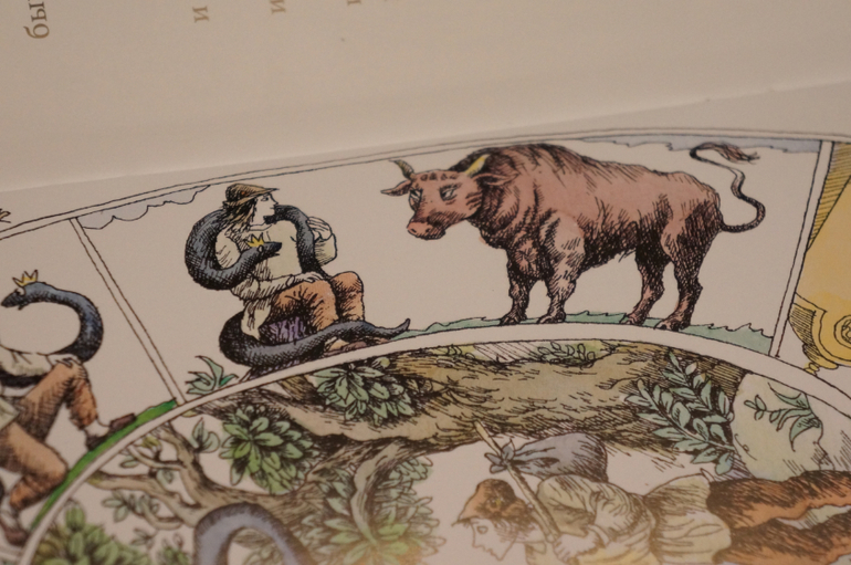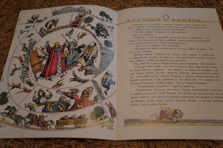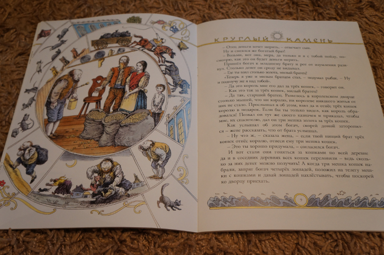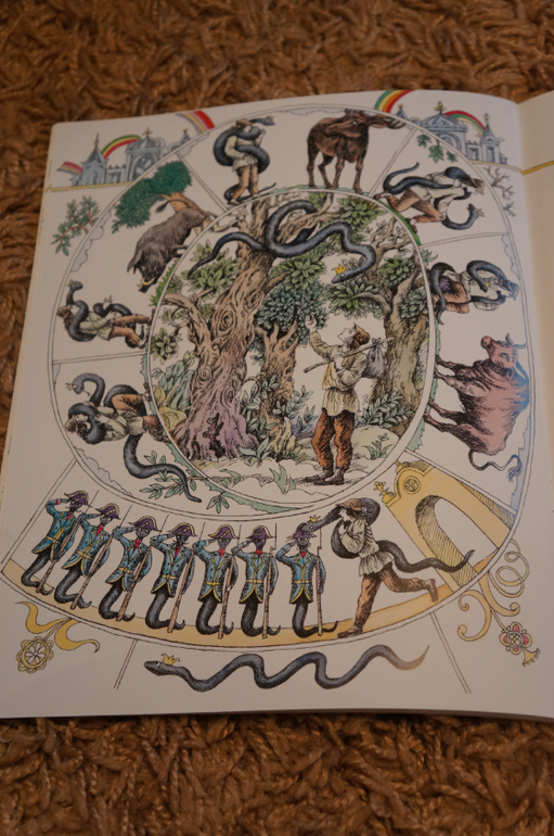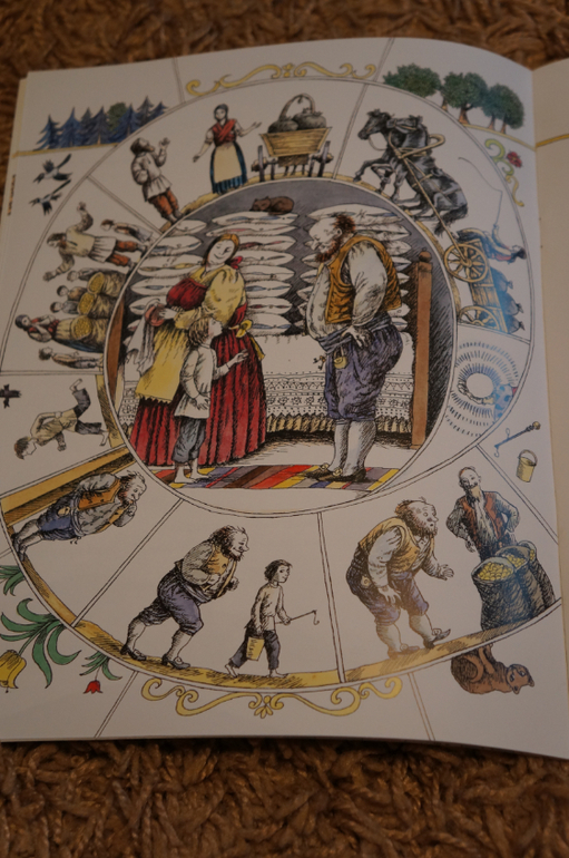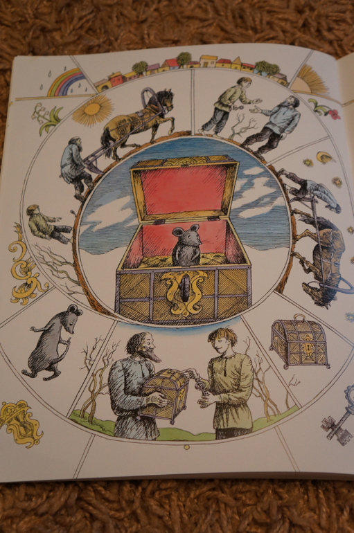 Благодаря интересной задумке все очень компактно. На каждом развороте справа текст, а слева иллюстрации. Рисунок в виде развивающейся спиральки. в каждом секторе прорисовано все происходящее в тексте и в центре главная картинка.