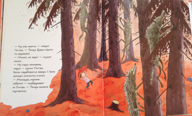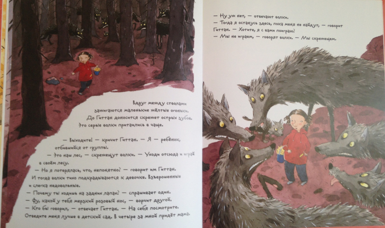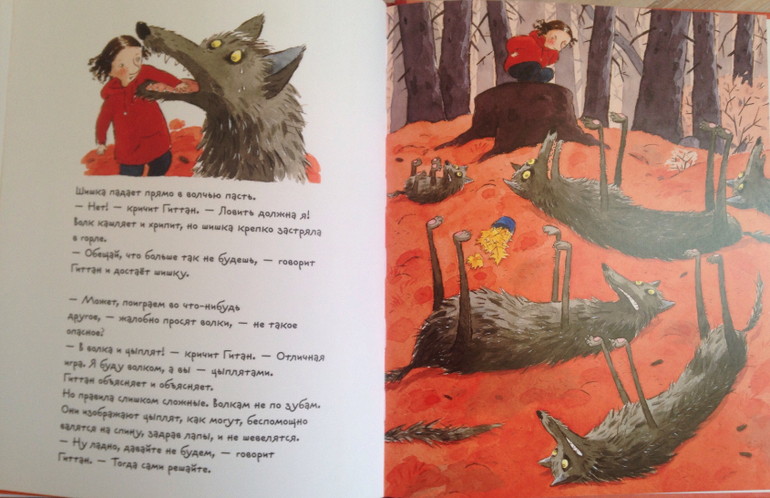 Однажды она отстала от своей группы детей на прогулке. Оказалась в темном-темном лесу совершенно одна. И тут её окружили волки, страшные, с острыми зубами и желтыми глазами. Наверняка, это ей причудилось. И девочка стала бороться со своей фантазией, обернув это все в игру. Бедные волки, как в мультфильме " Маша и медведь" в эпизоде " Давай-давай лечиться" просто до изнеможения доведены. Гитанн забрасывает их пасти шишками, заставляет притворятся цыплятами, увалившись на спину и оттопырив лапы, лечит, кормит грязью, загоняет их на ёлки, а потом сама их снимает с верхушки, высаживает коллективно на горшок( под кусток) и укладывает спать с колыбельной. Так она переночевала в лесу. А утром пошла искать дорогу к детскому саду, потому что её никто не кинулся искать. Волки грустят, что ей нужно уходить и приглашают зайти еще поиграть.