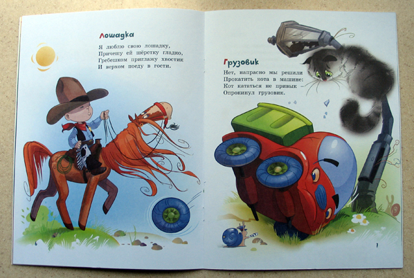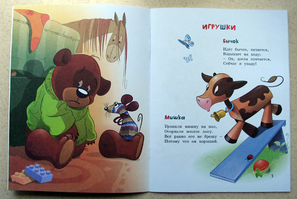 В книгу вошли такие стихотворения, как Бычок, Мишка, Слон, Самолёт, Лошадка, Грузовик, Мячик, Зайка, Кораблик, Козлёнок, Флажок, Барабан.