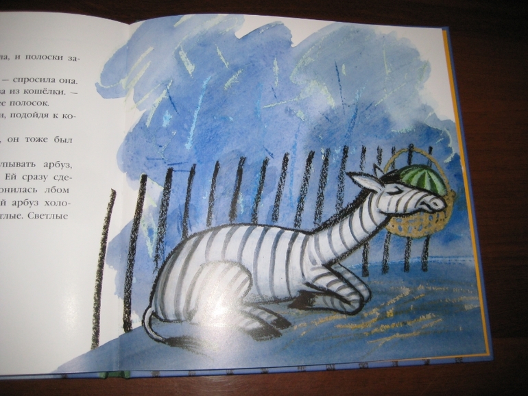 Зебра стала влажными губами ощупывать арбуз, словно головку маленького зебрёныша. Ей сразу сделалось хорошо, спокойно. Она прислонилась лбом к кошёлке и задремала. Свежий, гладкий арбуз холодил ей лоб и навевал сны. Они были светлые. Светлые в полоску".
