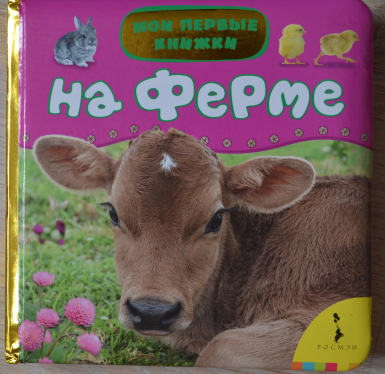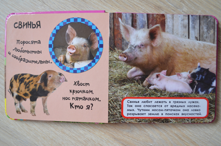 Книжка «На ферме» отличается от описанных мною ранее тем, что в ней представлены не нарисованные иллюстрации, а фотографии животных, про каждое из которых добавлено описание: чем питаются, что любят делать и другие интересные факты.