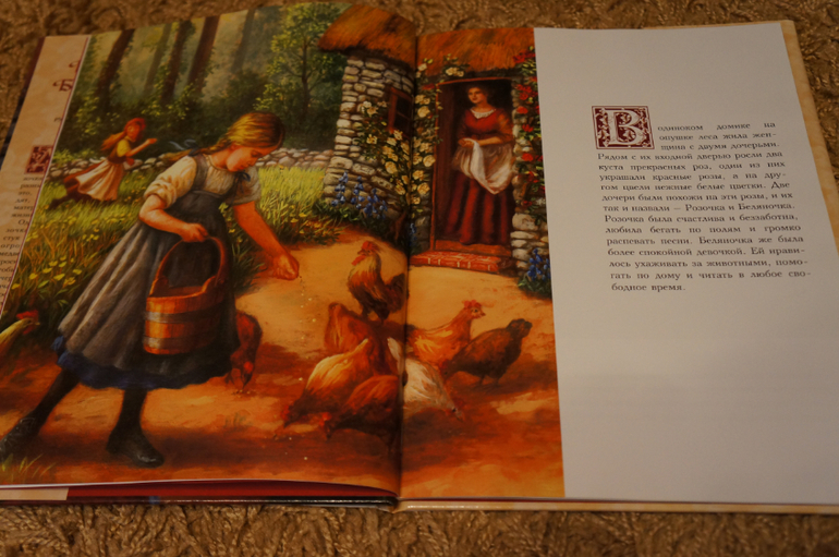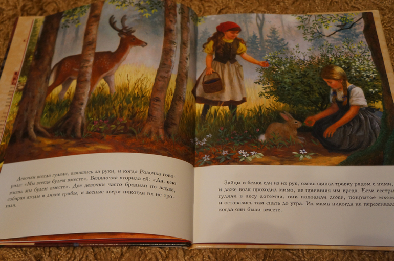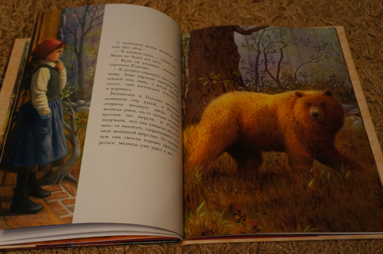 Сказка о двух сестрах Розочке и Беляночке, о их доброте и бескорыстной помощи. Они пожалели замерзающего медведя и всю зиму пускали его в дом погреться. Несколько раз спасали из беды ворчащего злобного карлика.
