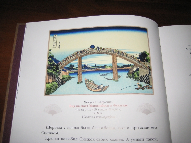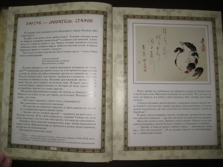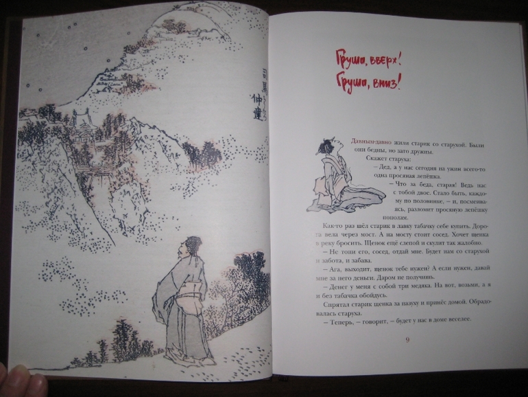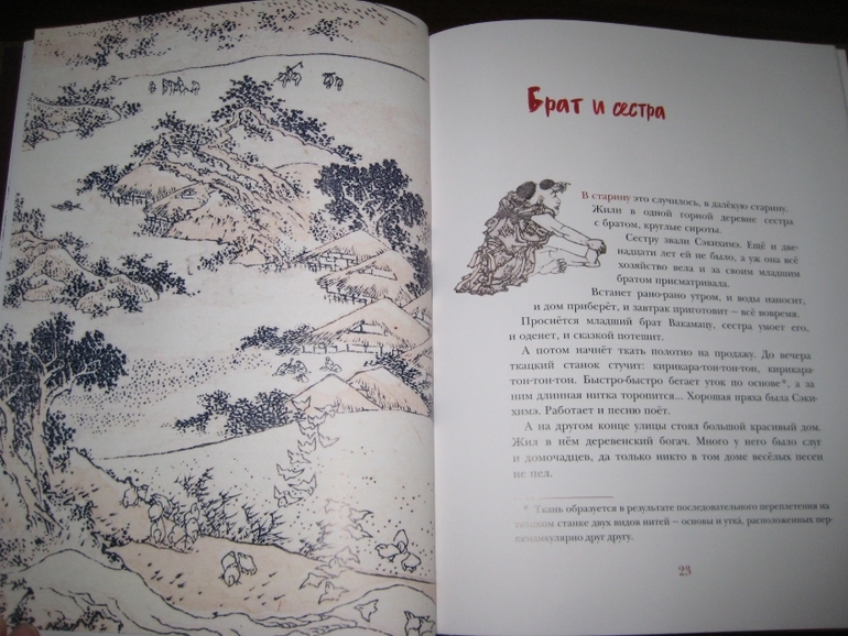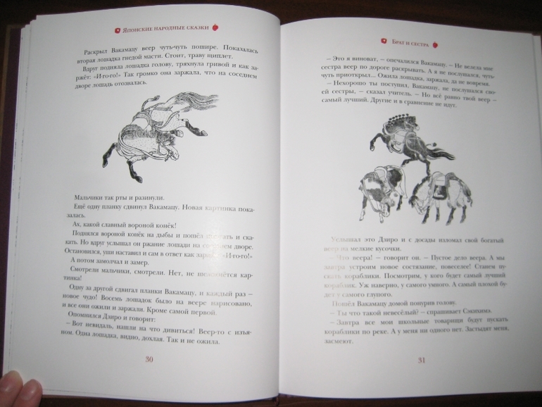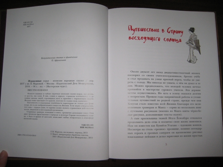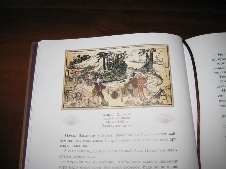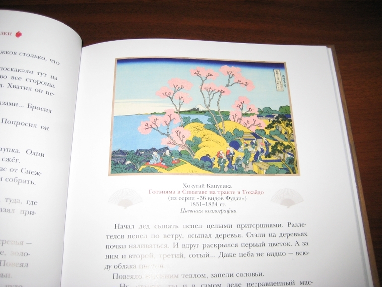 В "Японских волшебных сказках" оформление несколько доминирует над текстом, этому способствует и темно-бежевый фон страниц, и обрамление текста рамками с орнаментом, да и иллюстрации там практически на каждом развороте, за редким исключением. При чтении отвлекаешься, особенно отвлекают очень активные рамки. Впрочем, как всегда это дело вкуса.