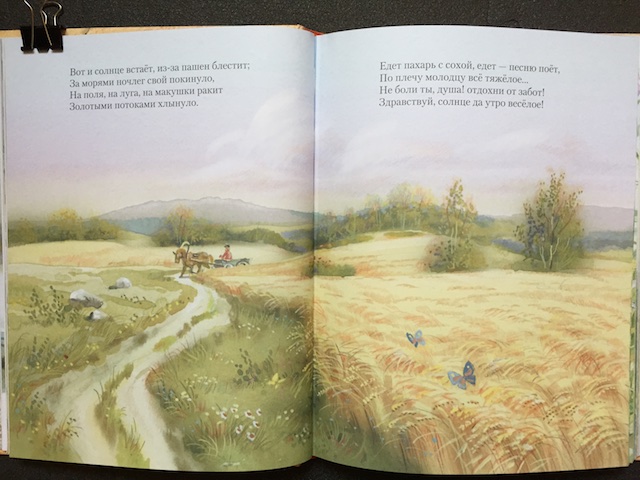 Офсетная бумага, поэтому краски кажутся слегка приглушенными, формат А4, часто встречаются иллюстрации на страницу, а не на разворот. Но оказалось, что книга замечательная и как раз намного больше подходит малышам, так как иллюстрации в ней точно отражают содержание стихотворений.