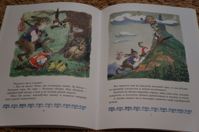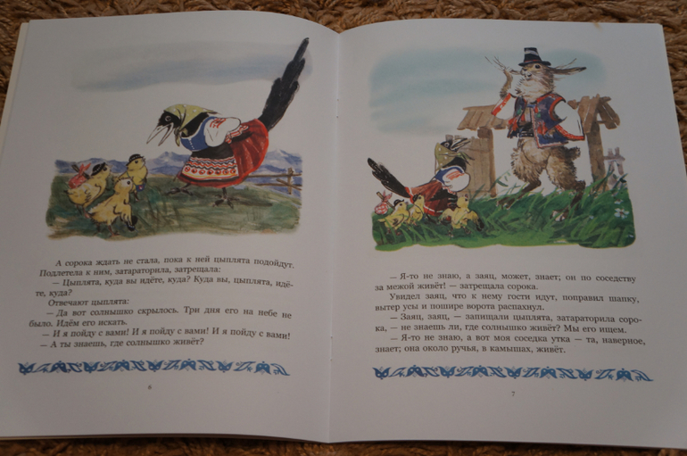 Добрые, яркие и по-настоящему детские картинки Карпенко. С небольшой крупинкой национального колорита. Обратите внимание на шляпки цыплят, одежды зайца, сороки, ежа, утки.