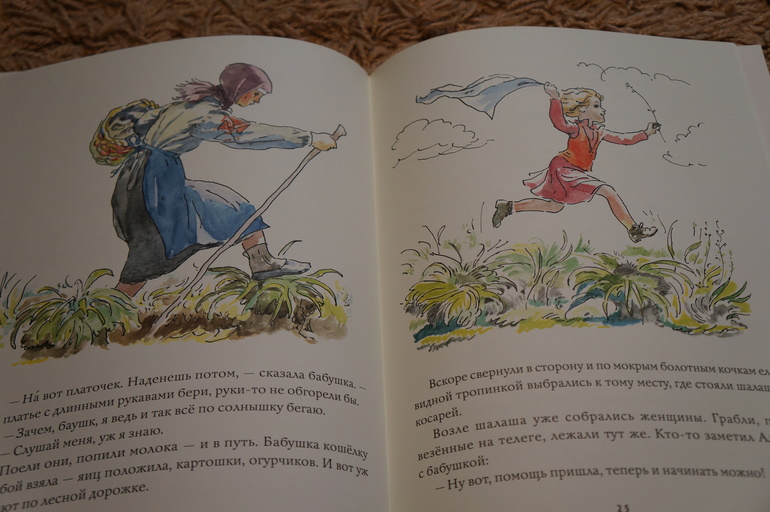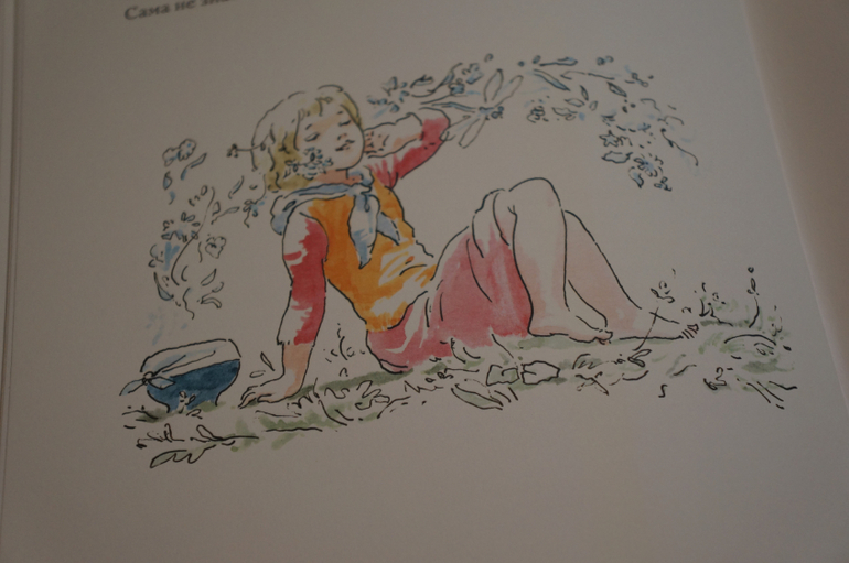Рисунки Епишина очень нежные, легкие и летние. Воздушно-невесомые, яркие с черными контурами рисунки украшают каждую страничку.