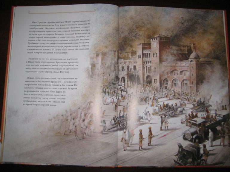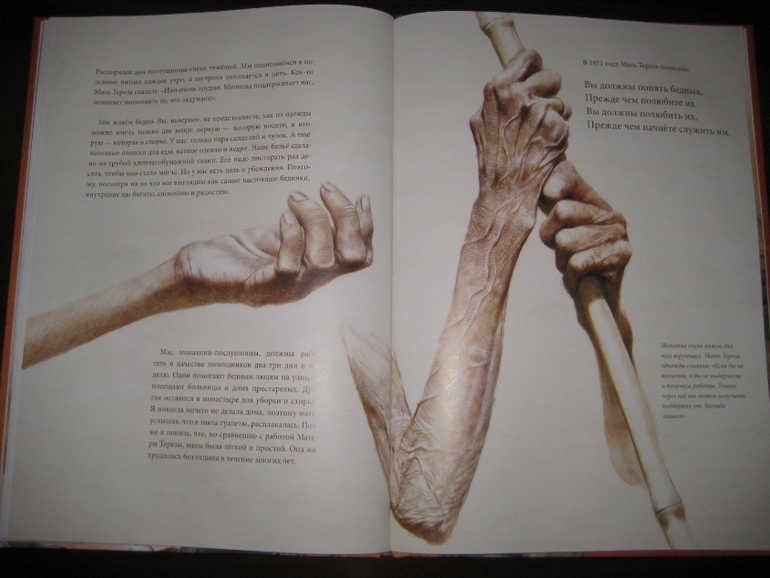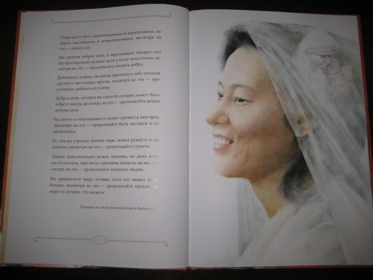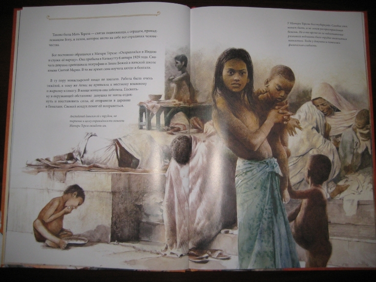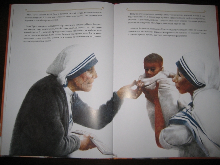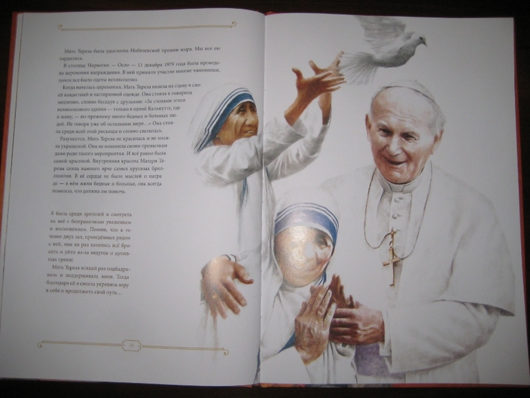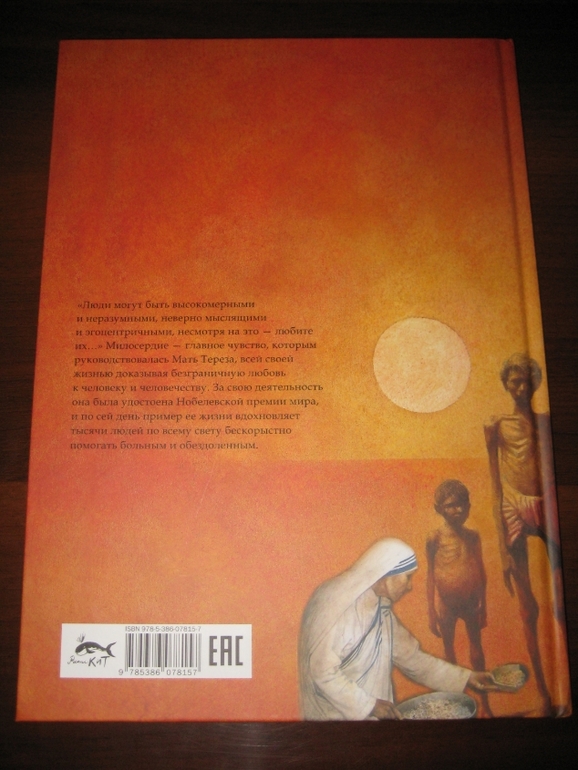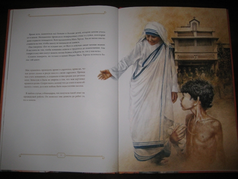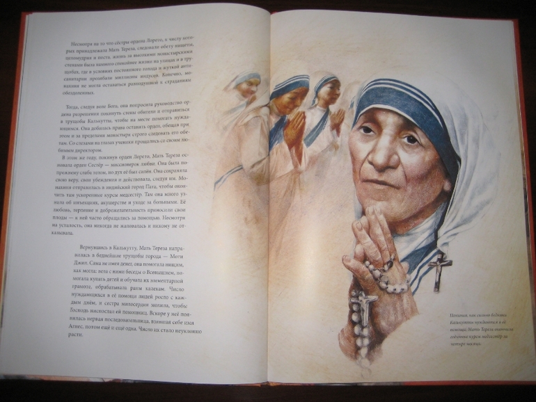А еще у меня проскочила мыслишка, что девушка определенно сотворила себе кумира: "Да, эта женщина походила на Деву Марию, которая любила всех на земле и взвалила на Свои плечи их тяготы и мучения. Я наблюдала за ней и видела подле нее несчастных, страдающих от голода, нищеты и болезней. Но даже с этими морщинами, проступившими на руках венами и в выцветшей одежде Мать светилась. И тогда я решила последовать за ней". Вот это уподобление пусть и святого, но все же земного существа матери Бога меня, честно говоря, тоже смутило.