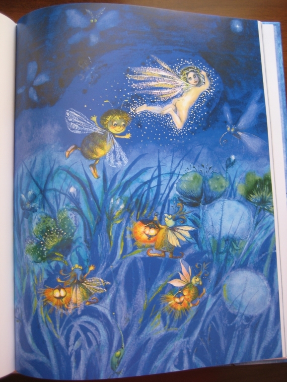 "Внезапно увидев под собой бездонную небесную синь, Майя очень испугалась. Она решила, что, должно быть, слишком высоко улетела и заблудилась в небе, но потом заметила отражения деревьев и с восхищением осознала, что это озеро с чистой голубой водой, раскинувшееся посреди леса в утреннем покое.