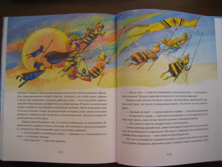 А вот эпизод о том, как Майя попадает в плен к пауку: "Тем временем день стал клониться к вечеру, и солнце ушло за кроны фруктового сада, через который летела Майя. Деревья давно отцвели, но пчелка еще хорошо помнила, как видела их во всем весеннем блеске: бессчетное множество цветов сияли ярче солнца в своей чарующей чистоте и тянулись к голубому небу. Кто был однажды опьянен их сладким благоуханием и нежным мерцанием, тот уже никогда этого не забудет.