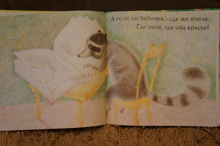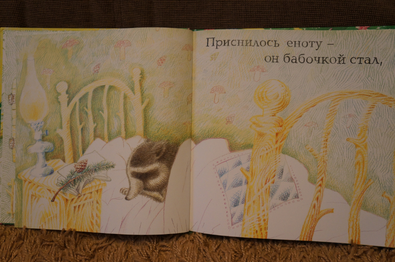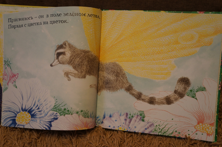 Енот видит радужный сон, что стал бабочкой и порхал среди цветов, жуков, кузнечиков, пчел....