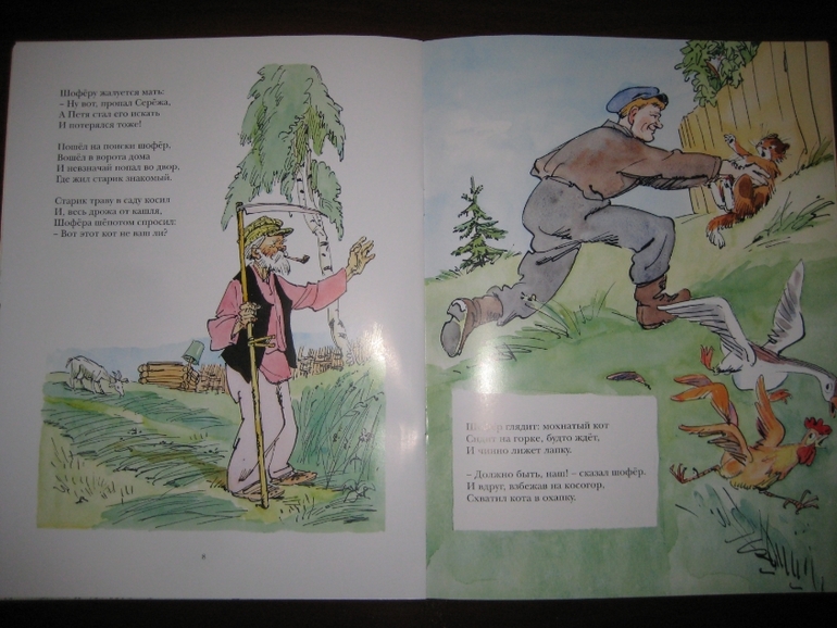 А в издании "Мелик-Пашаева" все сошлось воедино: звонкий стих с легкой, упругой рифмой, забавный сюжет и совершенно потрясающие иллюстрации Юрия Узбякова! Мы уже саму обложку долго разглядывали во всех подробностях: у Свена Нурдквиста есть книжка "Переполох в огороде", а тут у нас форменный "Переполох посреди дороги" получился :)