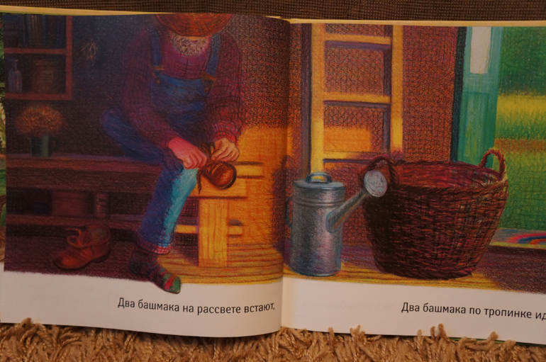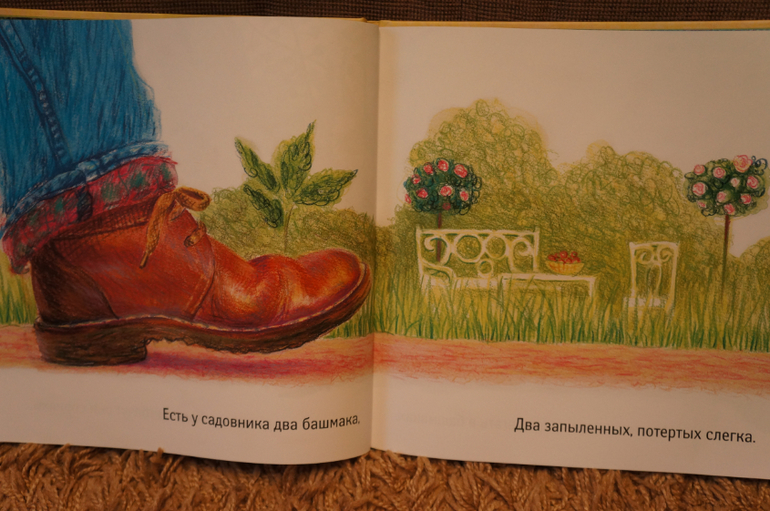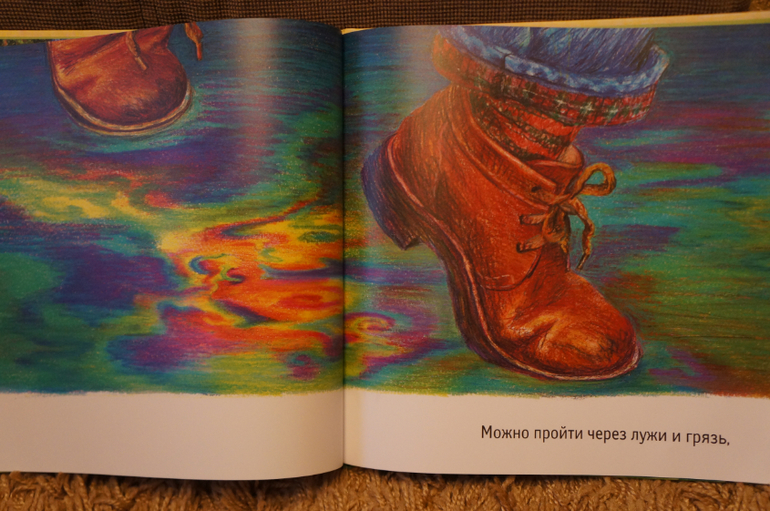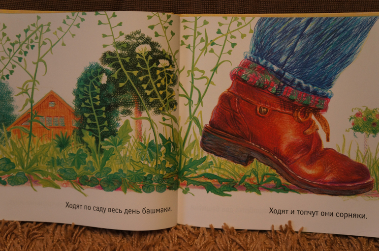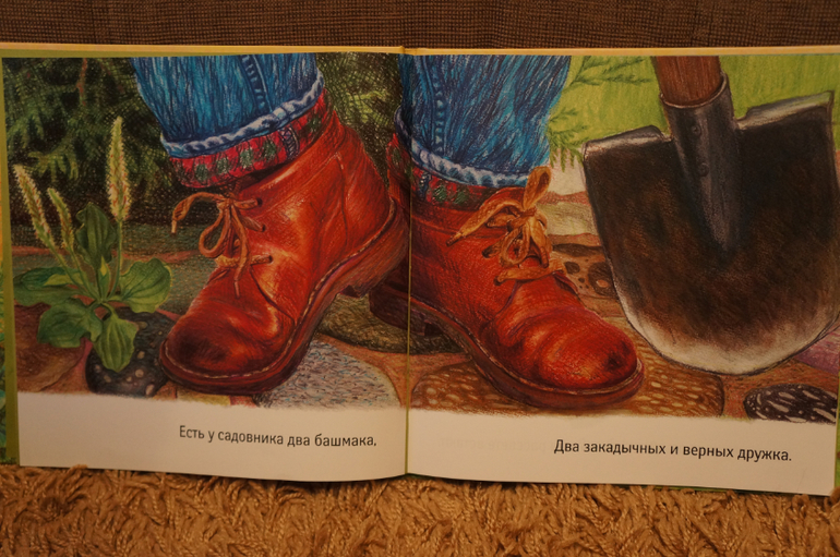 И самое главное - ботинки в главной роли! На каждой странице крупным планом только ОНИ. На страничке всего одна строка текста. Легкого и понятного для самых маленьких слушателей. У башмаков оказывается очень насыщенный и разнообразный день: