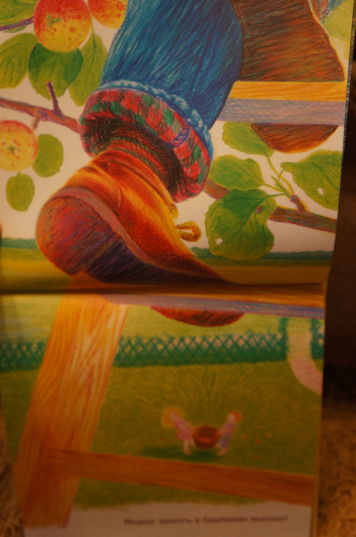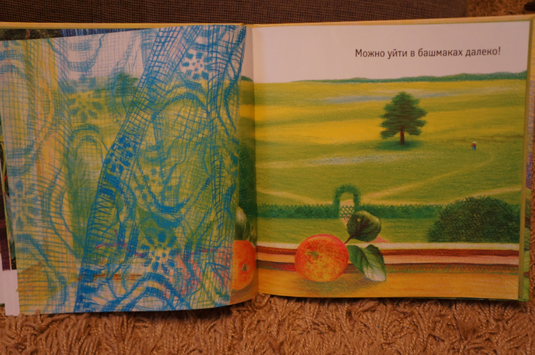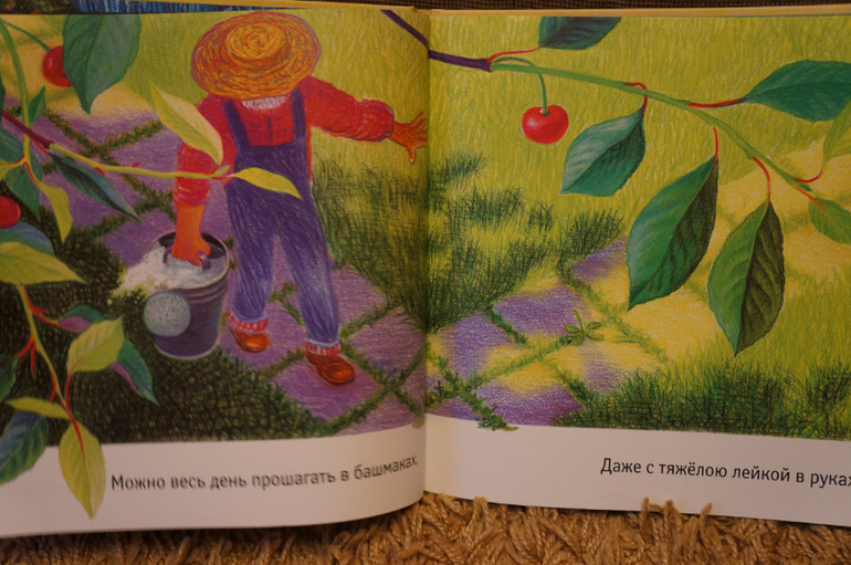 В книге шикарнейшие иллюстрации И.Киреевой. Солнечные, красочные, очень сочные и летние. вишенку и яблочки так и хочется съесть, ну очень аппетитненько выглядят.