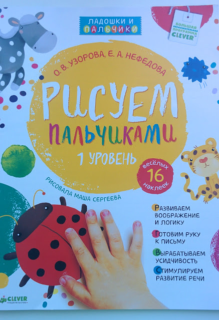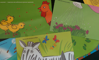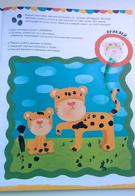 Эту книгу нам подарили на Новый год друзья, Владу было уже 2,5 года - я бы сказала, что для этой книжки поздно. Суть заданий - нужно пальчиками (ну или ватными палочками, например) ставить точки - леопарду, божьей коровке, снежинки и т.п. Картинки очень красивые.