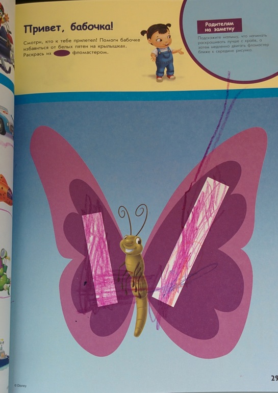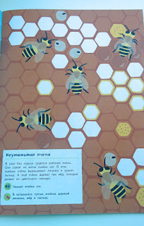 Задания: раскрасить картинку (стиль уже задан, то есть нужно докрасить небольшой кусочек, как сверху на фото - закрасить соты) или немного сложнее - как крылья у бабочек. Также много заданий именно с наклейками, причем где-то их нужно доклеить, чтобы завершить картинку, а где-то предполагается клеить на уже полностью готовый рисунок. Например, заклеить божьими коровками полчища тли на растениях.