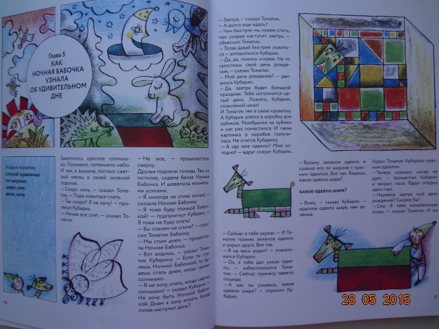 Теперь о книге. Сама подача материала мне очень понравилась - в игровой форме ребенок знакомится с математическими понятиями. Здесь нет вдалбливания, учебы как таковой. Томатик и его друг Кубарик просто живут, играют, попадают в разные ситуации и автор ненавязчиво вводит понятия (больше-меньше, длинный-короткий и т.д.). В книге не рекомендуется читать сразу несколько глав подряд, нужно время для усвоения и проверки материала. Но мы уже большинство понятий знаем и А. требовал сразу читать несколько глав подряд. И в книгу нужно играть! И играть не просто дома, а на улице, в магазине, обращать внимание ребенка на указанные в книге понятия. Книга очень нужная!