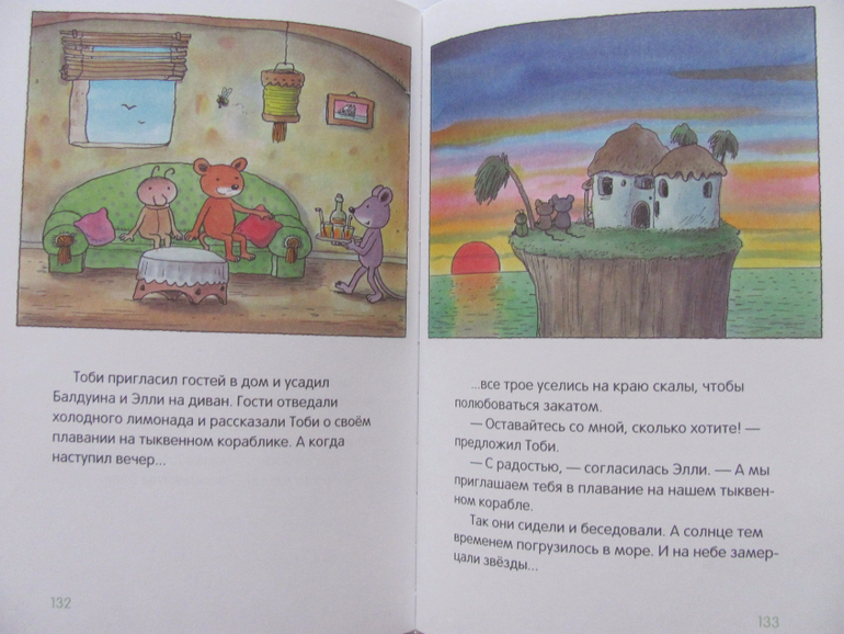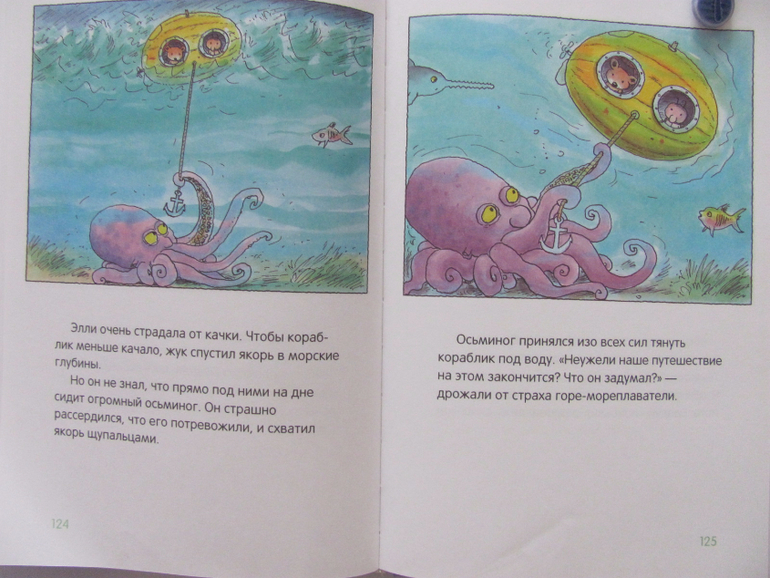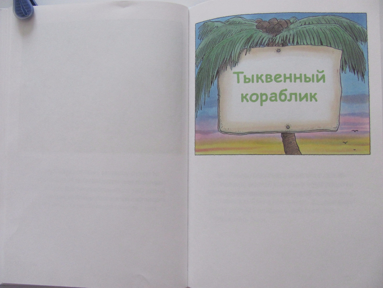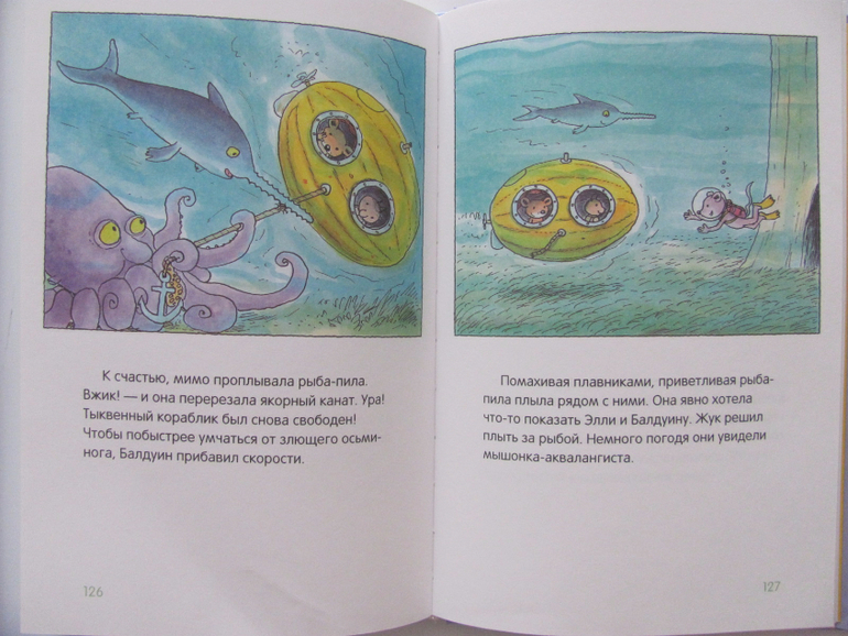 "Тыквенный кораблик" немного схож по замыслу с прошлой историей. Необычный кораблик, который придумал жук из тыквы, отправляется в плавание. Дальше шторм, и немного приключений. Осьминог, рыба-пила (узнали впервые) и домик на скале - все это понравилось ребенку.