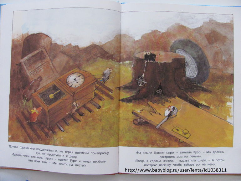 И работа закипела. Мышата подошли со знанием дела - решили строить дом на пеньке. А еще посмотрите, как они перетаскивают часы - на дощечках. И ребенок это запомнил, и когда мы перетаскивали тяжести на даче - предложил нам подложить дощечки))