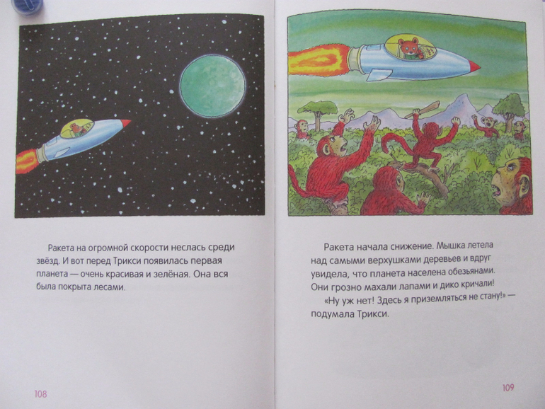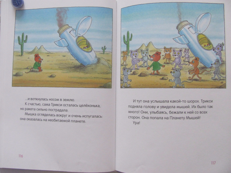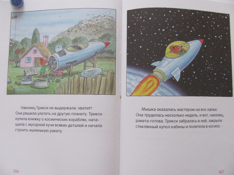 "Мышка в космосе" понравилась ребенку тем, что мышка придумала ракету и решила улететь на другую планету (проговорили, что мы живем на планете Земля, и что есть другие планеты). Ни одна из планет мышке не нравилась, и к этому времени как ракета сломалась и упала на планету...Мышей. Конец)