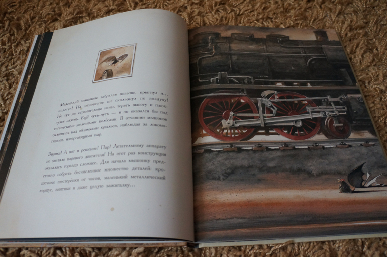 Мышонок не отчаился и начал конструировать новое изобретение. в новом изобретении были места для провизии. инструментов и топлива, а также широкие крылья, паровой двигатель и маленькие колесики, чтобы легче взлетать и приземляться.
