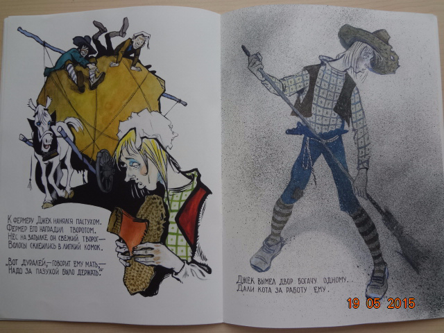 Я бы назвала историю на современный лад - тупой и еще тупее))) А вот Виктор Пивоваров создал удивительное стихотворение о глупом и нерадивом сыне, который все делал не так. То он творог на голове несет, то кувшин молока в кармане. А очень подходящие иллюстрации Лосина вносят динамику и характер. По лицу Джека я прямо вижу, что парню не повезло( Сын в восторге от книги! Особенно ему нравится эпизод с котом. Он всегда жалеет Джека и говорит, что котик поцарапал до крови его.