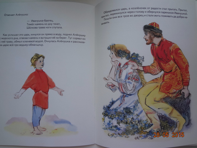Сказка А. понравилась, очень переживал за чистоту воды в разных копытцах) Пришлось объяснять, что так делать нельзя. А сегодня на прогулке был случай: сын закричал на всю улицу - "мама, смотри, котик пьет из лужи, сейчас станет козленочком"))) Я долго смеялась. По поводу текста - указано, что пересказ Нечаева. Но помнится мне из детства, что я читала другой текст. И колдунью в нем наказали. А здесь вообще ни слова нет. И Андрюша тоже заметил отсутствие злого персонажа (он за этим делом следит). Пришлось самой досочинять, что колдунью наказали и прогнали. Качество отличное, а иллюстрации Нины Носкович чудо как хороши!