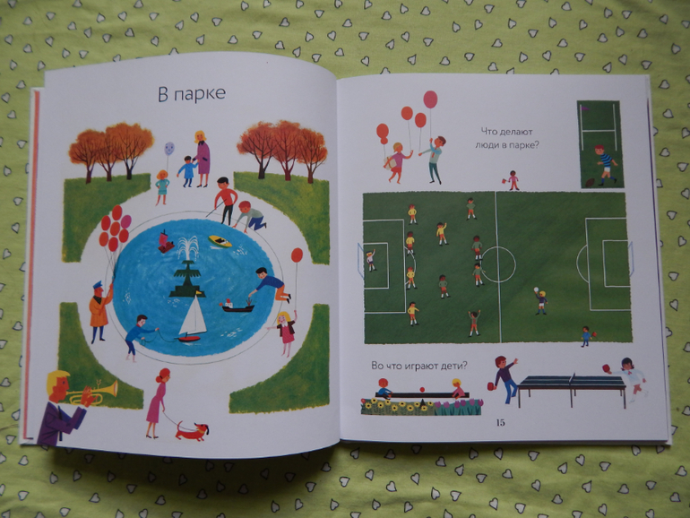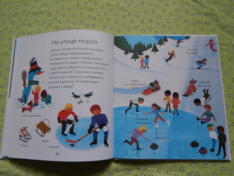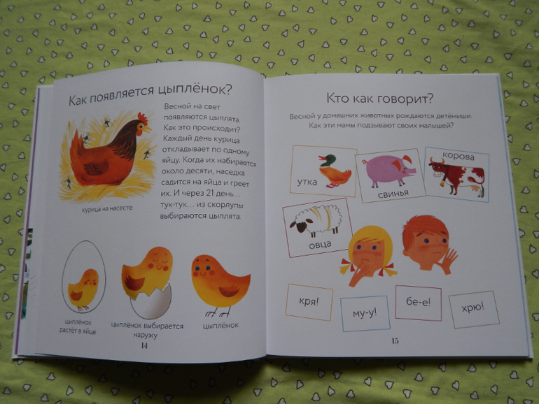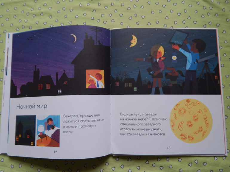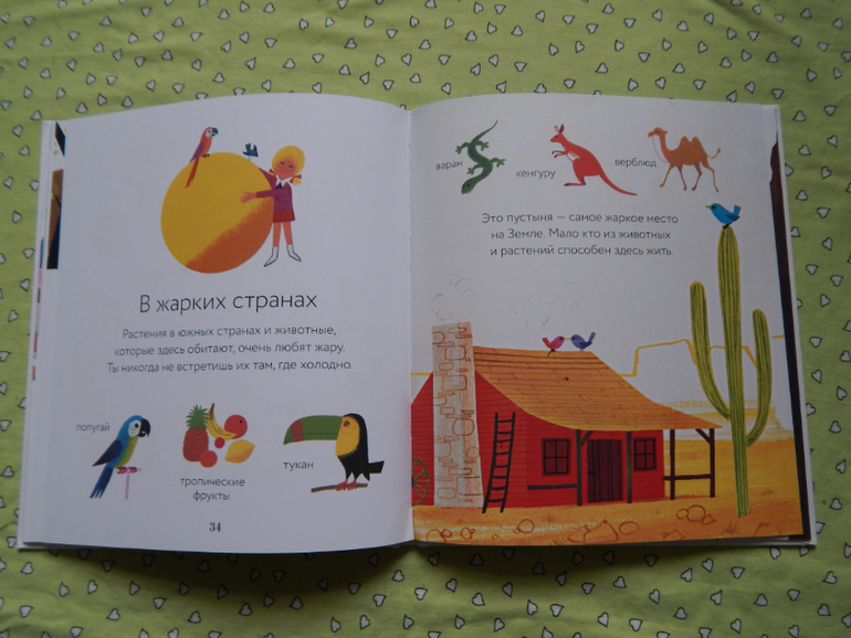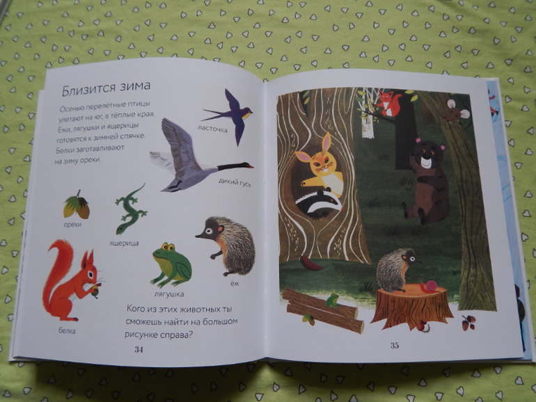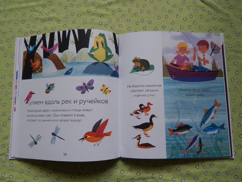 Дочка с удовольствием все рассмотрела, мы много говорили и вспоминали, кого видели в лесу, в деревне, на речке, что можно купить в магазине, на чем можно перемещаться, почитали о других местах нашей планеты - жарких и холодных странах, а ещё об альпинистах и космонавтах, но информации в этой книге, конечно, оказалось мало для нашего возраста) Вообще в этой книге меньше всего информативности, как раз для 2-3 леток.