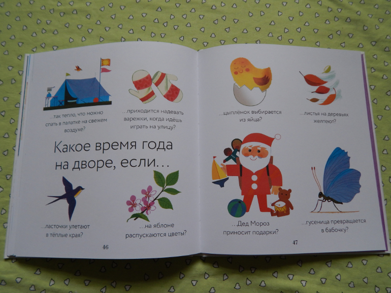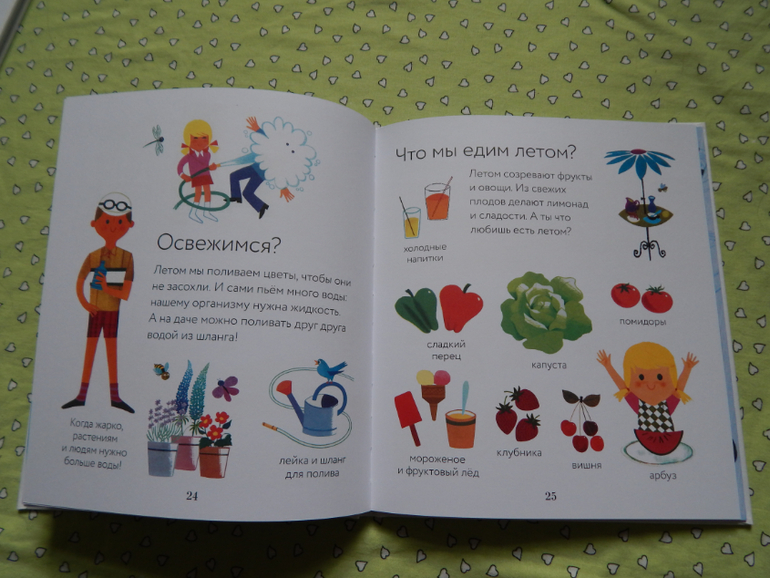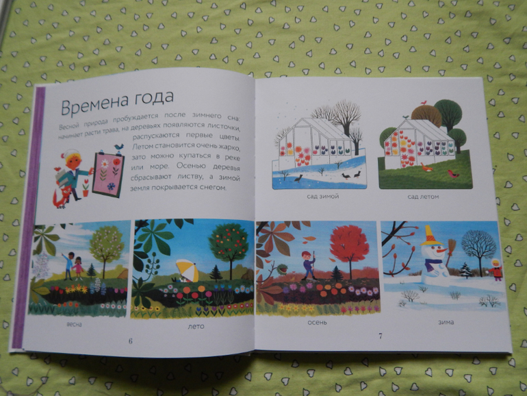 Условно книга разделена на 4 части по временам года и знакомит ребенка с происходящими событиями в разные времена года - весной тает снег и распускаются цветы , а фермеры начинают посадку; летом становится жарко, на рисунках видим, чем можно заняться летом, что выросло на огороде; осенью пора собирать урожай, ведь дни становятся короче и холоднее,часто идут дожди, птицы улетают на юг, а животные готовятся к зимней спячке; зимой выпал снег, но зимой тоже очень интересно, столько можно придумать)