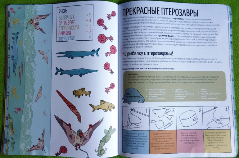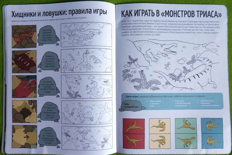 В тоже время это и книга-игра. В книге две игры: игра-ходилка и игра-«рыбалка», в которые можно играть большой компанией. Ребенку предлагается побыть в роли эораптора и выжить в джунглях среди других хищных динозавров, половить рыбу в древнем море.