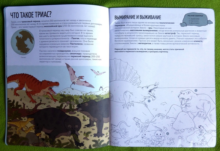 Информация в книге расположена таким образом, что дети смогут побыть в роли настоящих палеонтологов и проследить эволюцию динозавров. Узнают, кто жил в древние времена на суше, в воздухе и под водой. На каждом развороте рассказывается о тех или иных особях населяющих нашу планету в разные временные отрезки эпохи триаса.