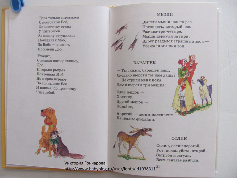 Богатое содержание, неплохие иллюстрации и огромное количество положительных отзывов. Ну все, подумала я, одна и на всю жизнь)) Но ребенок решил по другому! Ни в какую не хотел читать. В 1,5 года - откладывает ее....я решила - подожду, т.к в этом возрасте мой читатель почти не воспринимал больше-форматные книги . В 2 года не хочет даже ее брать, не интересна она ему, хотя часть произведений я ему читала фоном и часть любил прослушивать в аудио записи. Книга стояла на полке до 3 лет - иногда читали - "багаж", и сказки про мышонка. После этого я больше не доверяю отзывам на сайте поняла что все дети разные)) Возможно все дело в иллюстрациях, и работы художников С.Бордюг и Н.Трепенок не нравятся моему ребенку. И поиски продолжились...