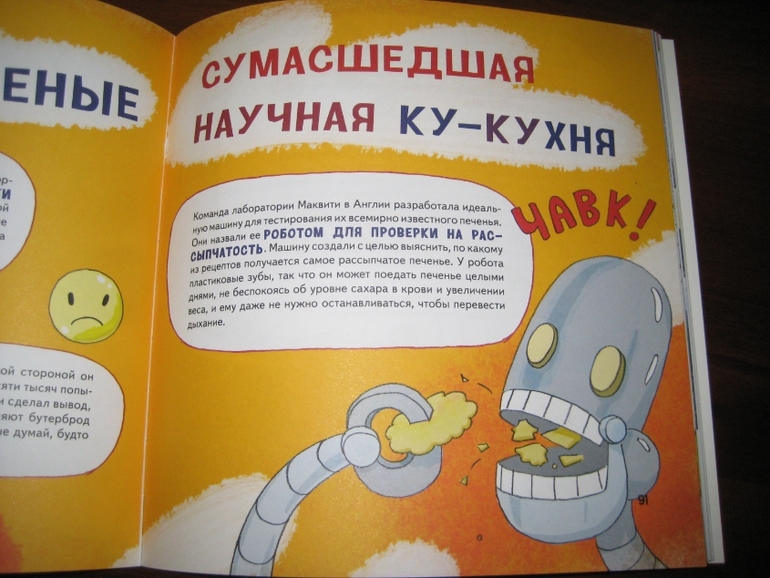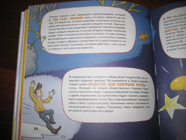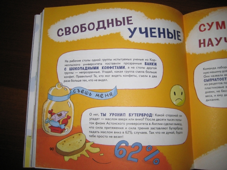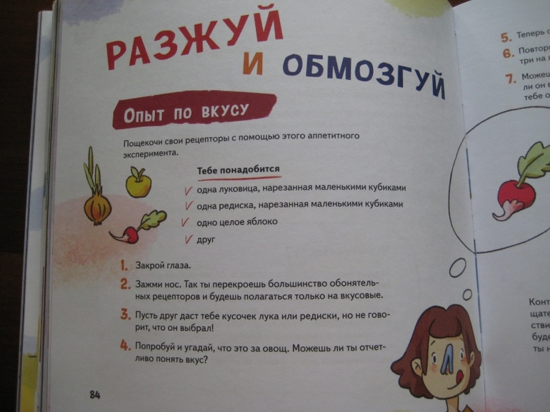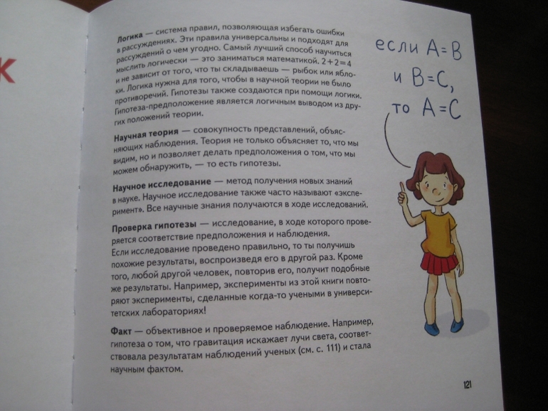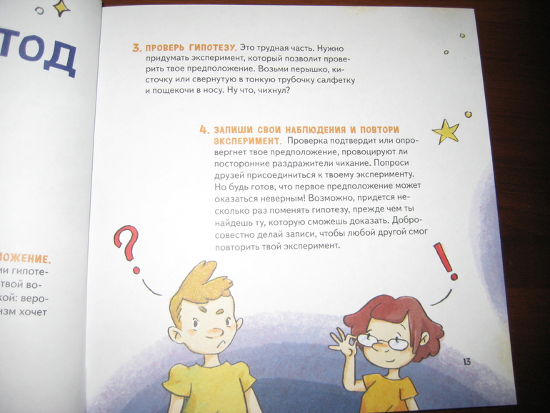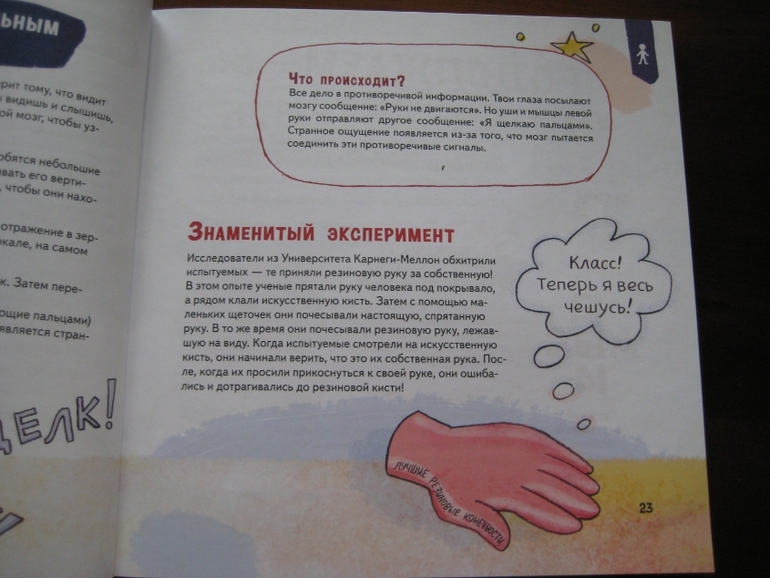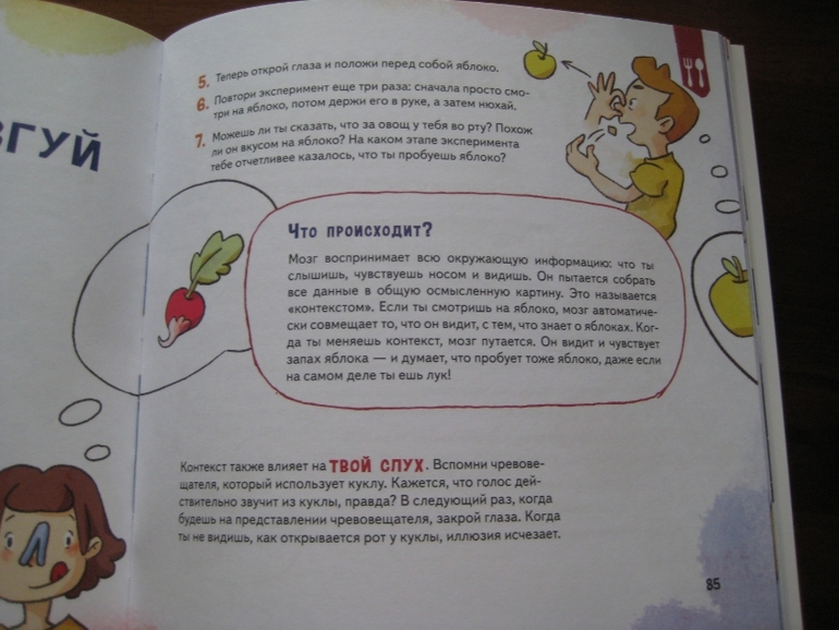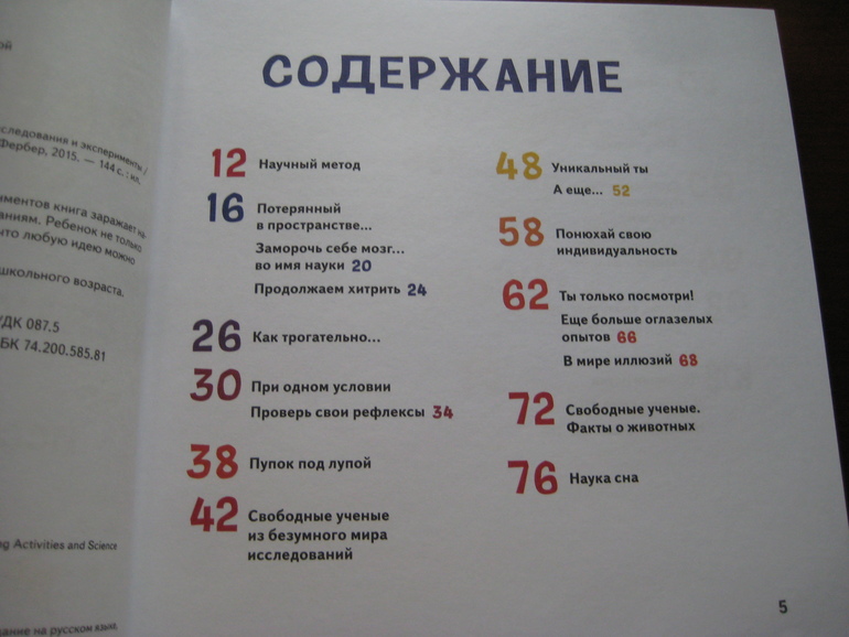Опыты отличаются чрезвычайным разнообразием и достаточно нестандартны (ну, например, можно провести опыт, подтверждающий вывод о том, что на восприятие информации влияет контекст), действительно очень интересны и в то же время доступны и просты в проведении. Это не то что опыты с элементами периодической системы Менделеева, где самым безобидным средством является... огнетушитель :) Попутно и ненавязчиво предлагается немного развивающей информации, определения понятий, научные факты. В самом конце книги есть словарик научных терминов, причем, они сгруппированы тематически: