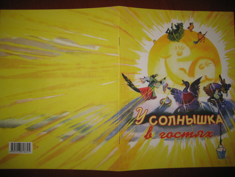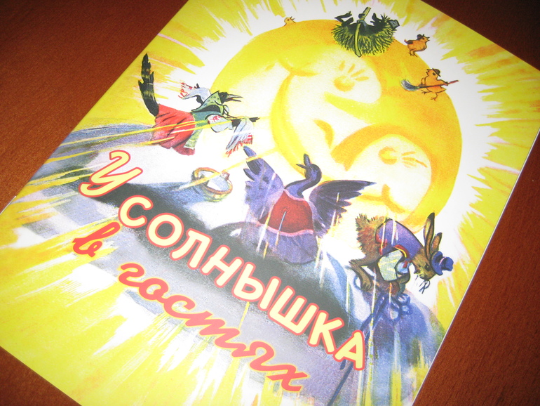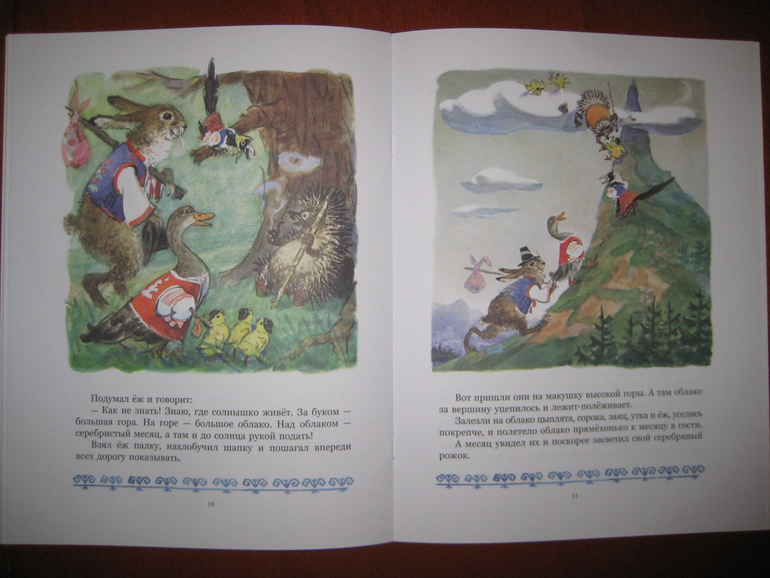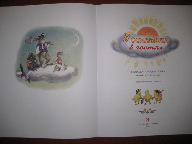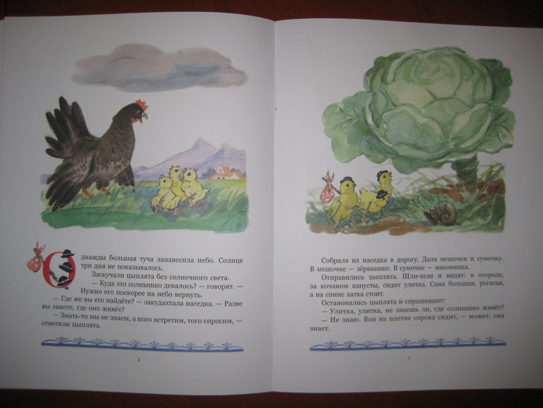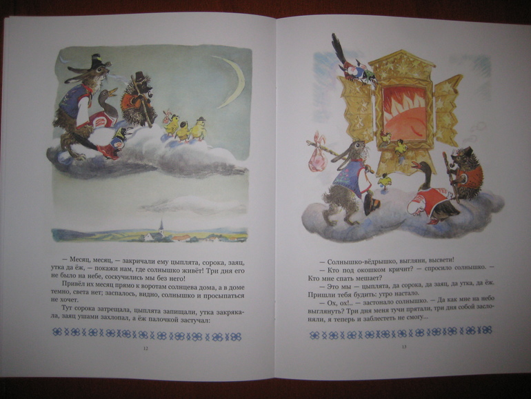 Вот и здесь в первой половине сказки - знакомый мотив в духе: "Мышка - за кошку, кошка - за Жучку, Жучка - за внучку..." и т.д. А начинается все с того, что детки (в смысле цыплятки) обнаружили, что большая туча занавесила небо и солнышко пропало. Малыши отправляются его искать, а по дороге к ним последовательно присоединяются с желанием помочь в нелегком деле: улитка, сорока и другие официальные лица другие персонажи. И тут начинается самое интересное, настоящие приключения! На облаке друзья отправляются сначала к месяцу, а затем в гости к солнышку и давай его будить! Да как активно! Уж они и воду таскали, и водой его умывали, и полотенцем вытирали, и колючей щетинкой начищали, и соринки смахивали... "Выглянуло солнце на небо, чистое, ясное да золотое. И всюду стало светло и тепло". Вы много где встречали образ солнышка, которое звери приводят в божеский вид? Неожиданный поворот сюжета :)