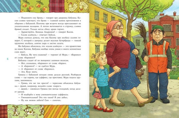 С Мурой, бабушкой и Гришей случаются всякие случайности. Особенно порадовала глава про мальчика Васю Прохвостова из детского сада, малолетнего террориста, донимавшего всю группу. А оказалось , что маме и папе очень занятым и богатым не было дело до сына и сбросили его на нянек... ОЧень жизненная книга, скажу я вам! Читать можно от 5 лет и до 12 точно)) Немного иллюстраций потрясающей Ольги Громовой,