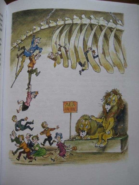 Она увидела Льва на свободе и стала пятиться. Она пятилась, пятилась, пятилась до тех пор, пока не очутилась в пустой львиной клетке. Тогда она вскрикнула и упала без чувств.