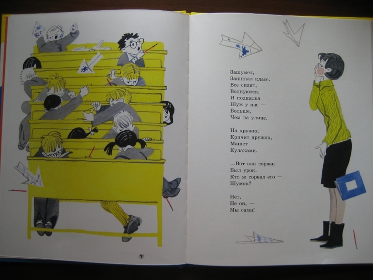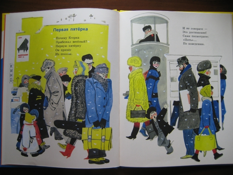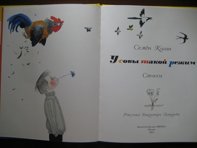 Не устаю удивляться, насколько разной может быть художественная манера у Владимира Гальдяева: здесь, например, иллюстрации очень яркие, насыщенные, забавные и ироничные - под стать стихам! :) Удачно, что бумага выбрана не белая - легкий бежеватый тон снижает контрастность и рисунки смотрятся выигрышнее, во-первых, и читать комфортнее, во-вторых.