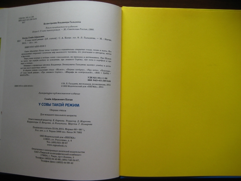 Книга у "Нигмы" получилась приятная: увеличенного формата, как у тонких книжек на скрепке, но в твердой обложке (24 страницы), офсет, крупный шрифт. Качество печати хорошее, во всяком случае мой экземпляр без нареканий (отпечатано в Твери, ОАО "Тверской полиграфический комбинат").