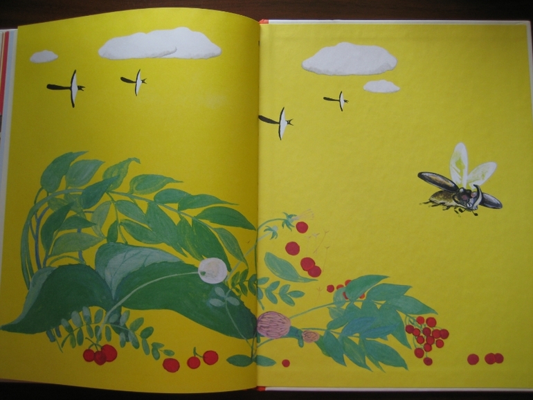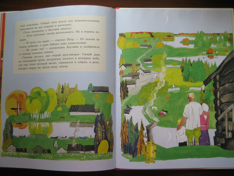 А здесь ребенок задал вопрос: рисунки явно связаны друг с другом, но составляют ли они единое целое или это отдельные фрагменты и потому они локализованы каждый на своей странице? Я предположила, что это все-таки разные эпизоды жизни Петра и жука :)