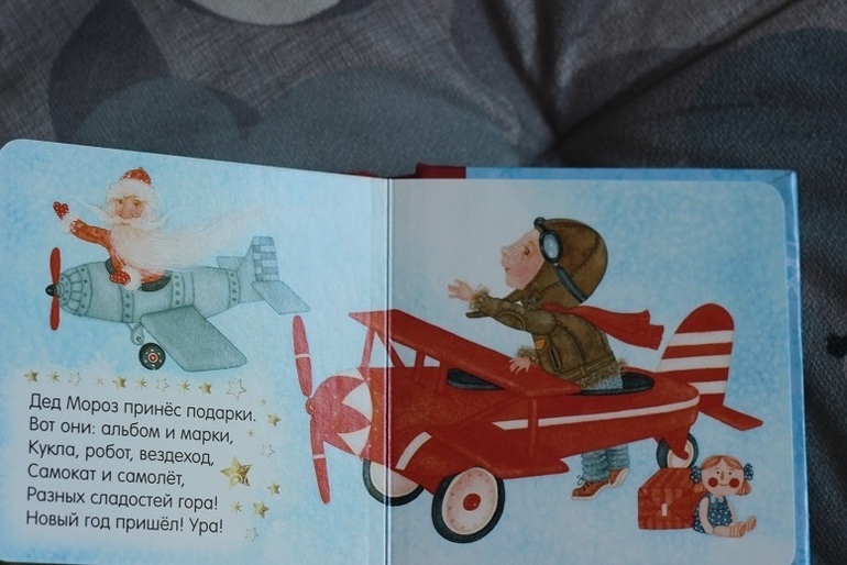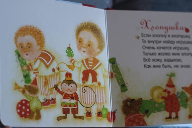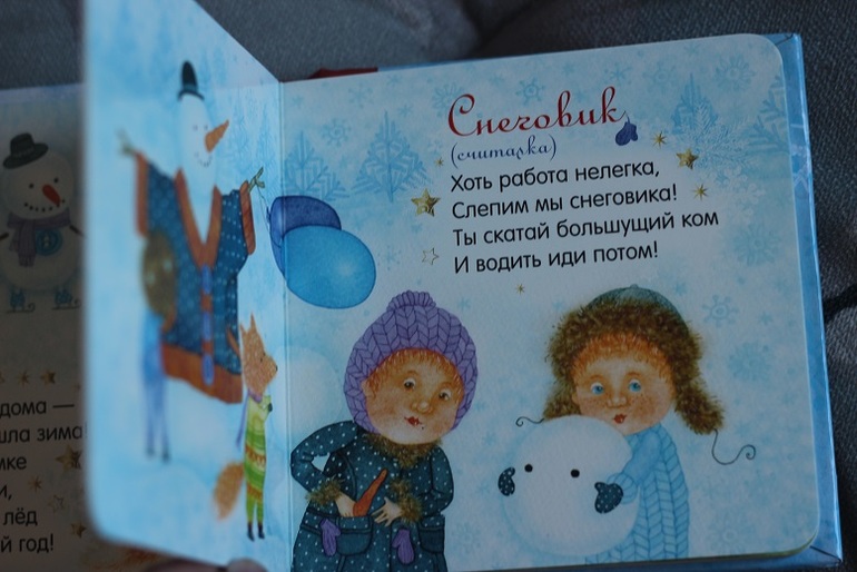 В общем, отличная. Называется "Зимняя сказка. Новый год". Хоть и недешевая за несколько скупых разворотов. Но я искала именно такую - с минимумом текста, простейшими стишками и считалочками, понятными авторскими картинками, «духом 31 декабря», елочками, карнавалами… И картонными глянцевыми страничками, чтобы и в пир, и в мир, и не страшно.
