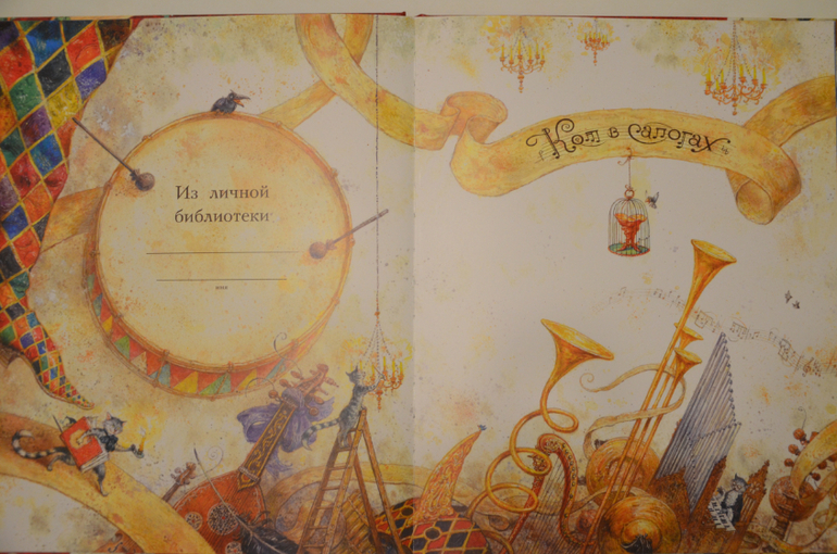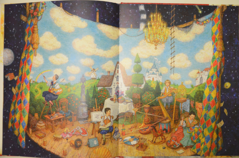 Книга проиллюстрирована в виде театра, на первом развороте занавес