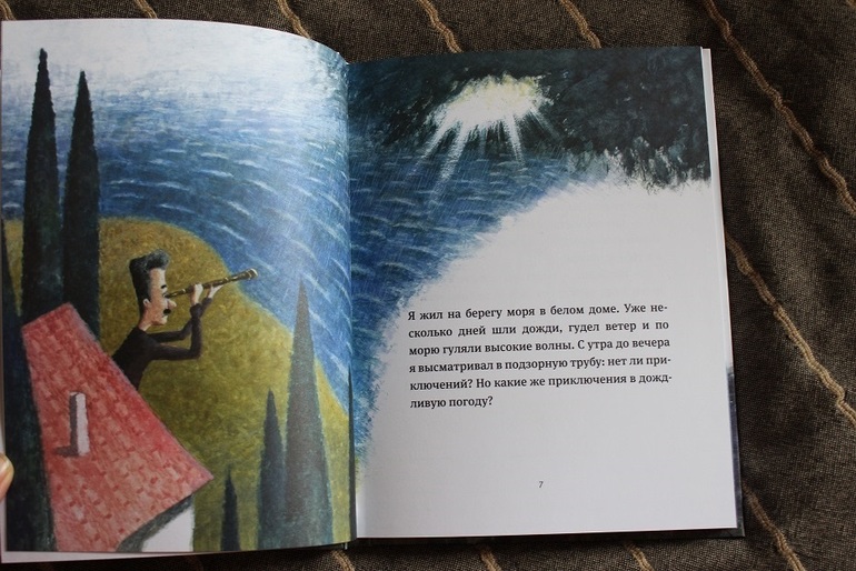 «Я жил на берегу моря в белом доме. Уже несколько дней шли дожди… // С утра до вечера я высматривал в подзорную трубу: нет ли приключений? Но какие же приключения в дождливую погоду?»