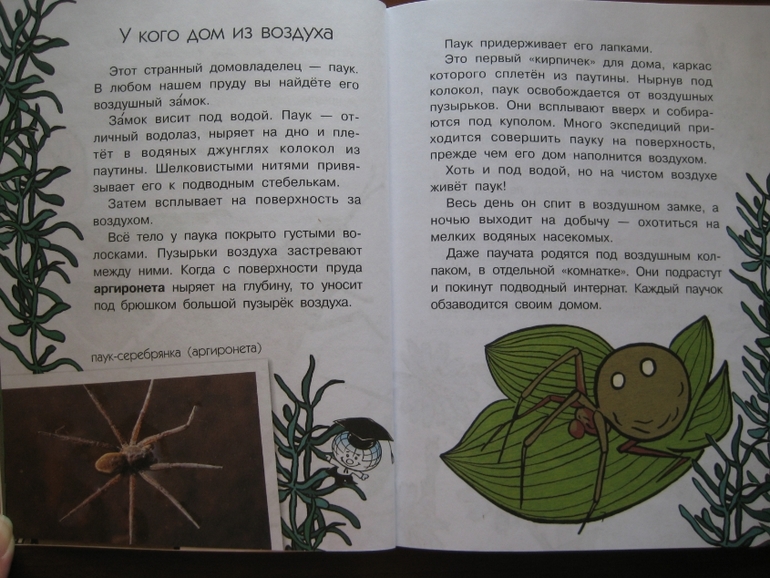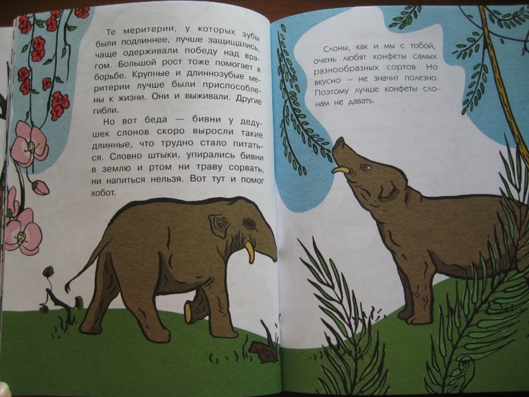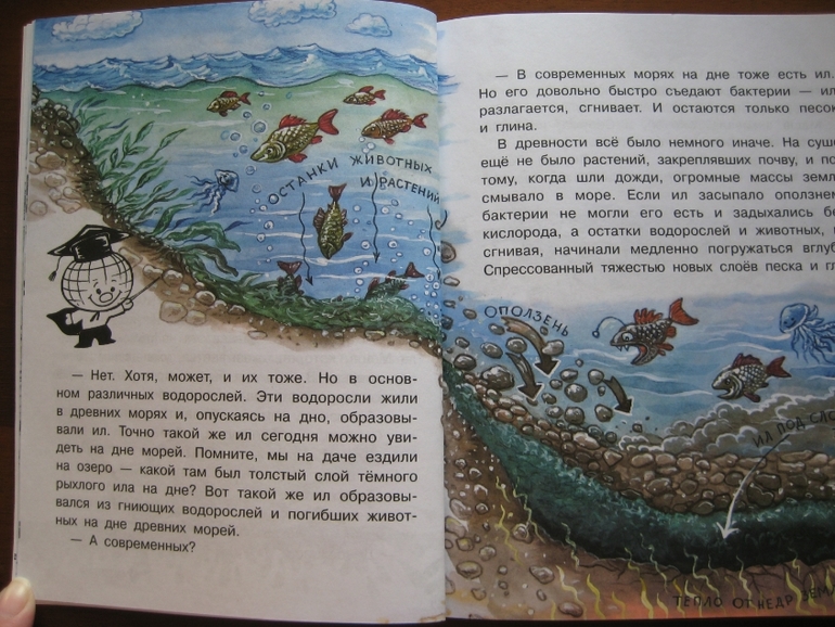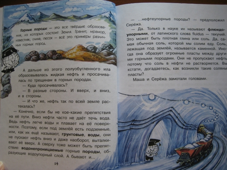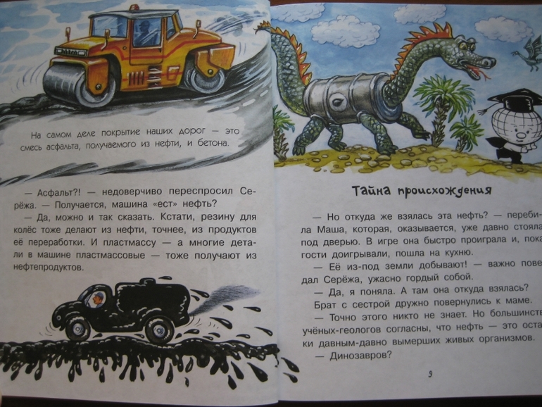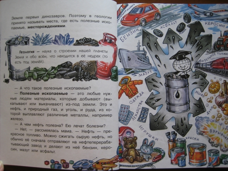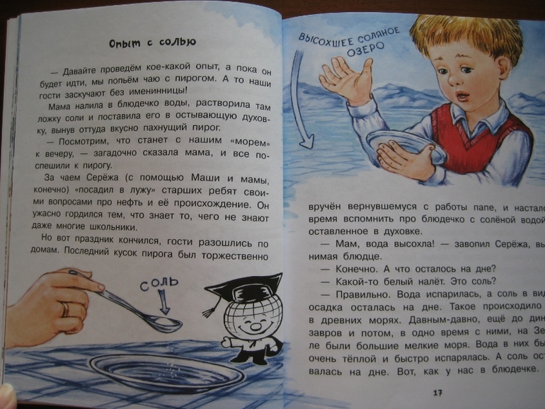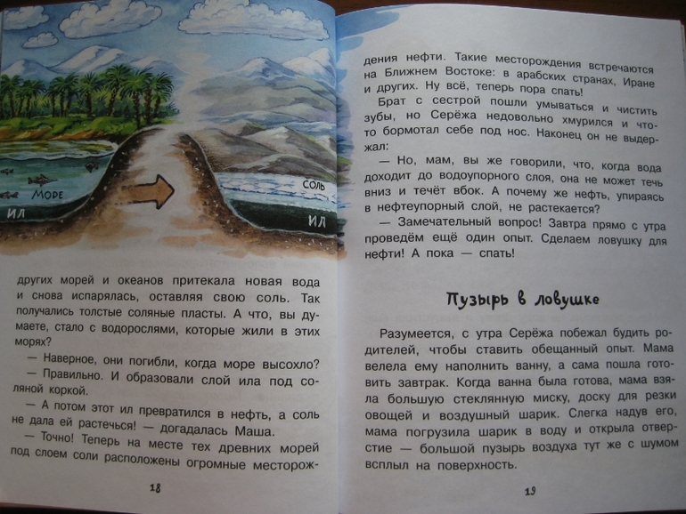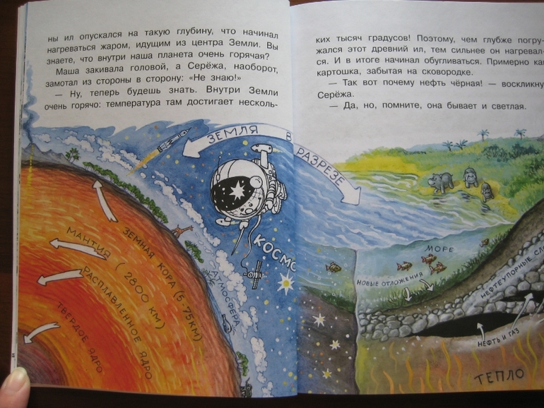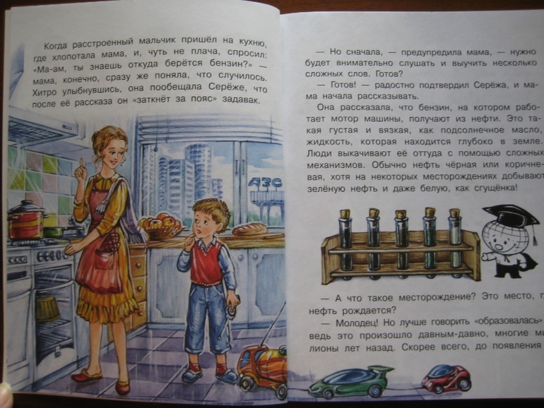 Повествование построено принципиально иначе: здесь есть сюжетная канва, в которую ловко вплетается разного рода полезная информация. Сюжет традиционный: любознательные дети задают вопросы, так сказать, "докапываются", а умные и очень компетентные родители незамедлительно и обстоятельно удовлетворяют тягу к знаниям :) Причем, не только рассказывают, но и проводят разного рода эксперименты. Что, конечно же, делает книжку еще интереснее, поскольку ребенок видит возможность практического применения, экспериментальной проверки полученных знаний.