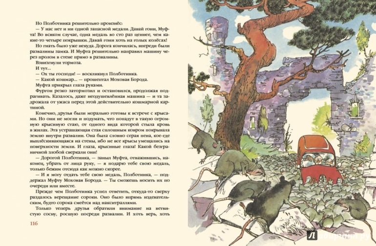 Следующие иллюстрации относятся к одному из напряженнейших моментов повествования, который начинается словами: "Но гнать было уже некуда. Дорога кончилась, впереди были развалины замка. И Муфта решительно направил машину через пролом в стене прямо в развалины"...