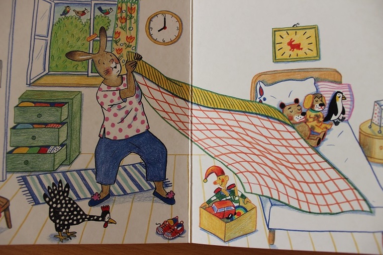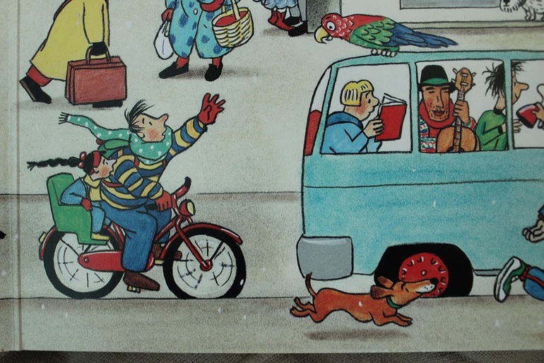 Рисунки очень похожи на те, что найдутся в Летней книге или Зимней. Рука автора видна - те же современные лица. Никакого волшебства, все как в жизни. И это мне очень симпатично на фоне розовых слонов и полосатых жирафов других художников.