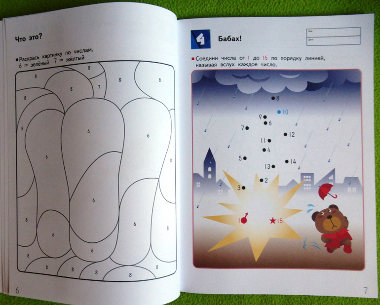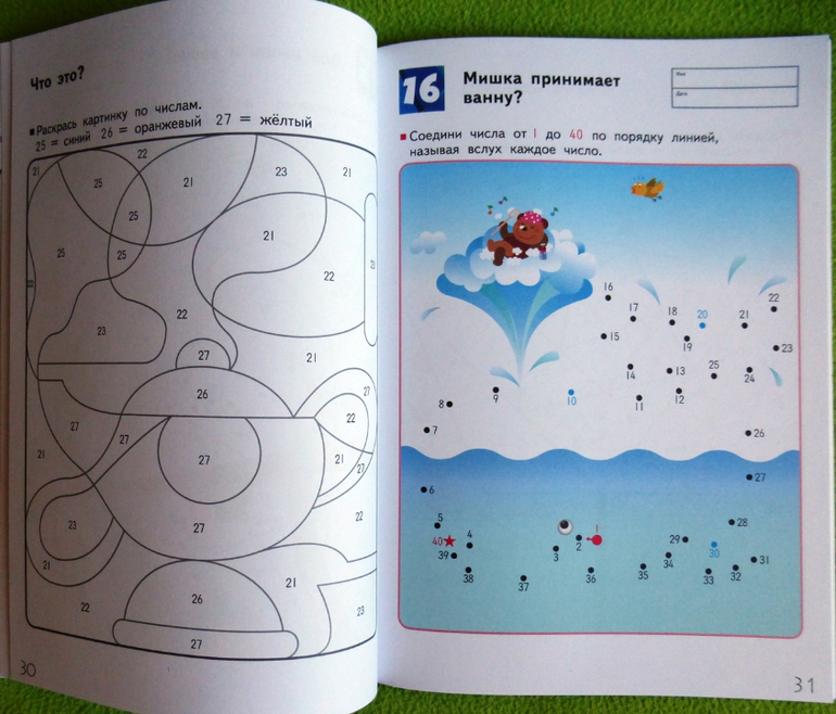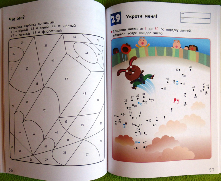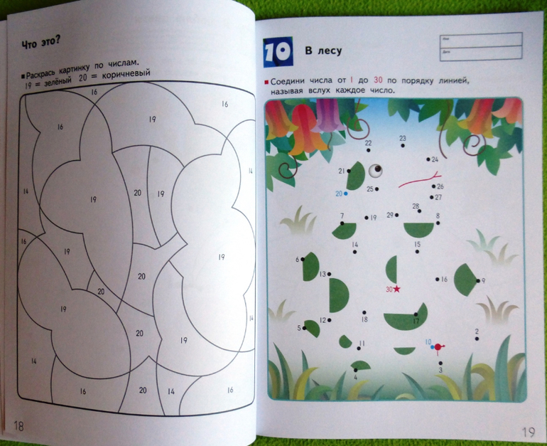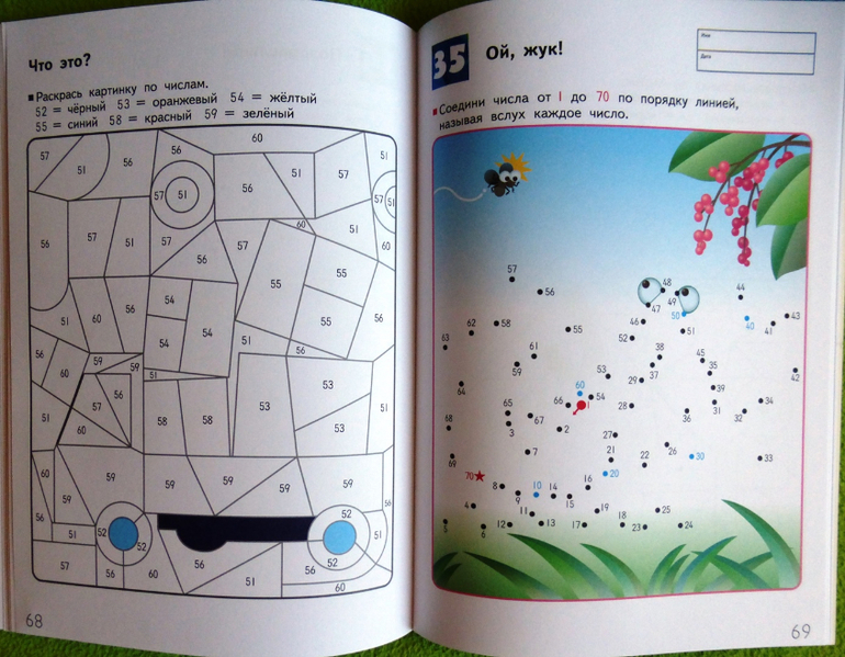 На нечетных страницах задания, в которых требуется соединить числа по порядку, а на четных страницах картинки для раскрашивания по номерам, которые помогут одновременно развить и навык узнавания чисел, и мелкую моторику. Во время выполнения этих упражнений ребенок должен называть числа вслух. Цель этой рабочей тетради - научить ребенка оперировать числами от 1 до 70. Приобретенный навык поможет ему приступить к изучению основ математики.