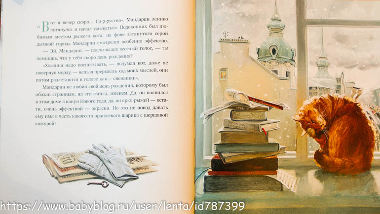 Внимание: книга, - скорее, альбом иллюстраций Павловой, текст в ней милый, но довольно-таки банальный. История рассказывается, смысл есть, но все очень плоско, наверное, поэтому имя автора сего опуса даже не вынесено на обложку. Для Кирюхи я оживила историю,она добрая, в нее легко верить, мы много раз проиграли ее, поэтому книга хорошо идет, и конечно, играет роль то, что за окном у Павловой всегда Петербург. И Кирюха, тыча пальцем куда-то поверх головы Мандарина, всегда уточняет: «Это мой город???»