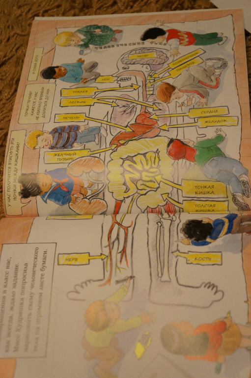Мы вместе с учениками мисс Кудряшки отправились в путешествие по человеческому телу. Наш маленький автобус побывал в желудке и тонкой кишке. Кровяные клетки перенесли нас в сердце. а потом в легкие и вскоре оказались в мозгу. После этого, спустились по позвоночнику и оказались в мышцах ноги. По пути исследовали спинной мозг.
