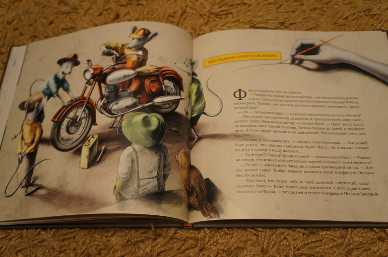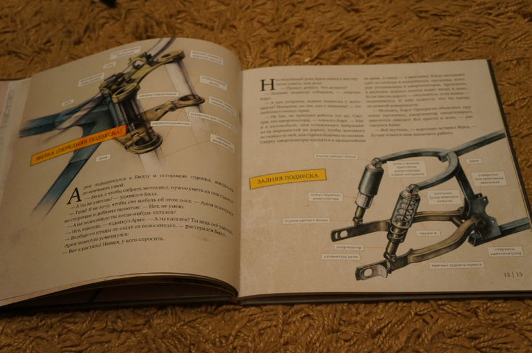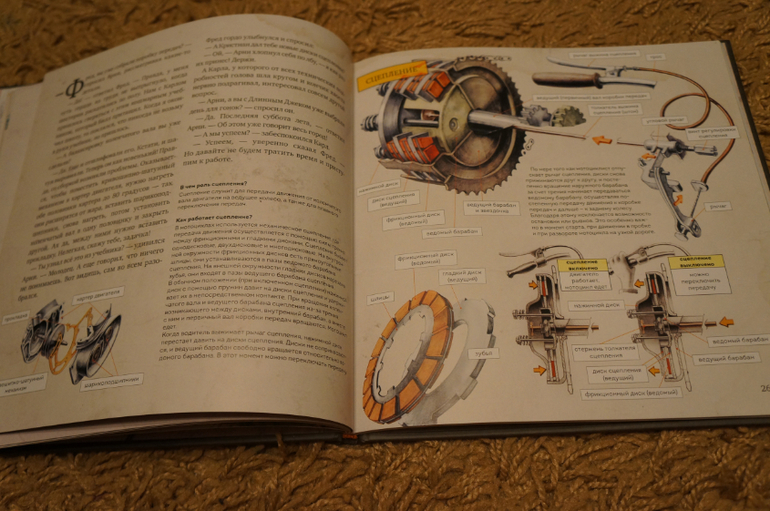 Траверса, подвеска, сальник, тормозной кулак. пружина возврата, сцепление, шлицы..... Казалось бы, от такого обилия технических терминов вот-вот голова пойдет кругом. Но нет! В книге все так подробно расписано, техническая информация вплетается в художественный текст. Поэтому все доступно и легко. Даны подробнейшие картинки на которых подписаны все детали. Читаешь книгу и кажется все очень легко, хоть сейчас бери и собирай мотоцикл по этой инструкции.