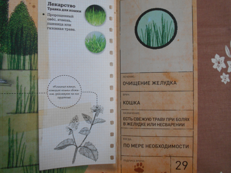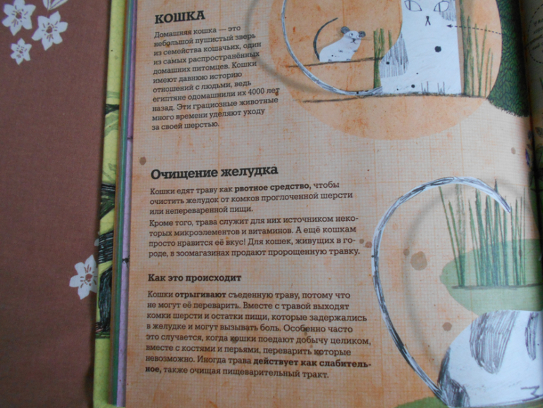 А кошкам, оказывается, просто необходима трава, они её едят, как рвотное средство, потом кошки её отрыгивают ,т.к. не могут переварить, но с травой выходят комки шерсти и остатки пищи, которые могут вызвать боль в желудке.